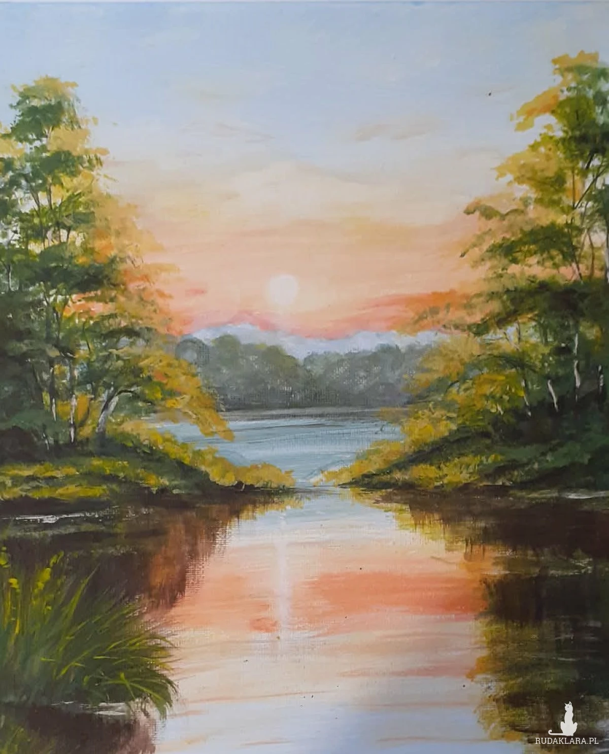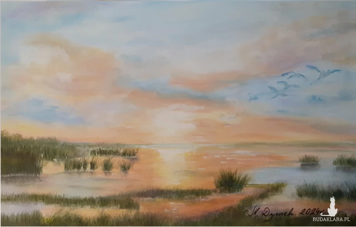 - Tematyka: Polski krajobraz z motywem wody i nieba. Brzeg spokojnego jeziora o zachodzie słońca emanuje ciszą i nostalgią
