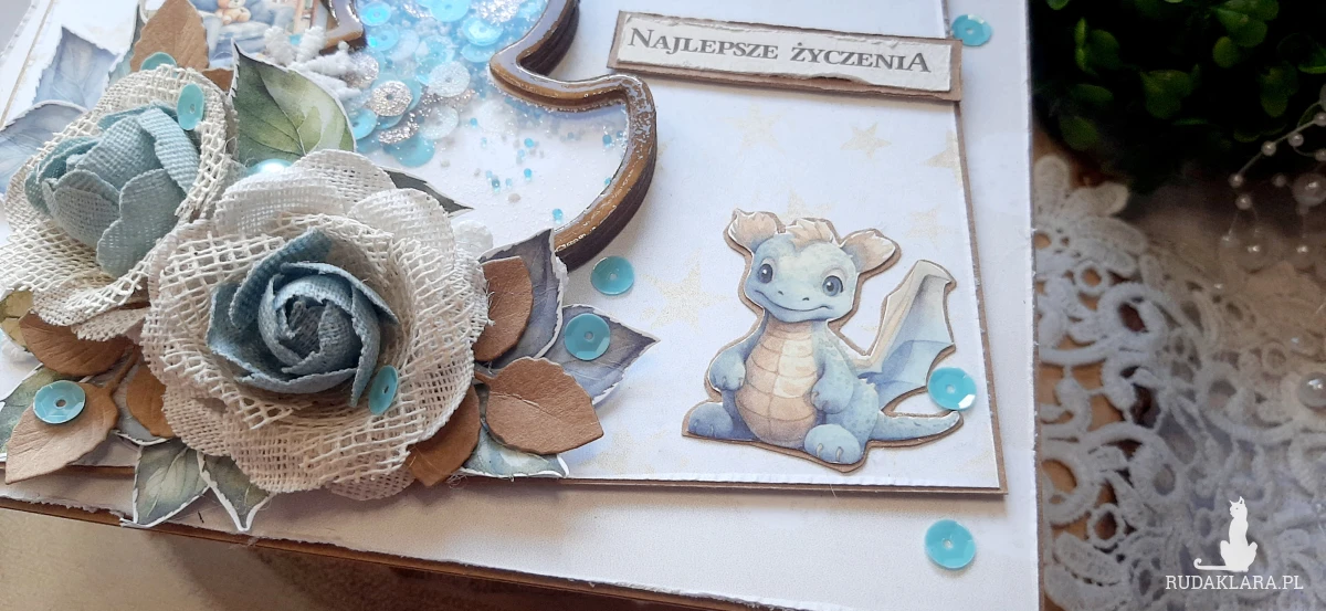 Kartka okolicznościowa dla chłopczyka na bazie kraftowej do pudełka. Na kartce znajduje się shaker i ozdobiona jest kwiatami. W środku kartka na życzenia podklejona taśmą dwustronną. Wymiary kartki 18x13 cm. W zestawie z kraftowym pudełkiem o wymiarach 18,5x13,7x3 cm.