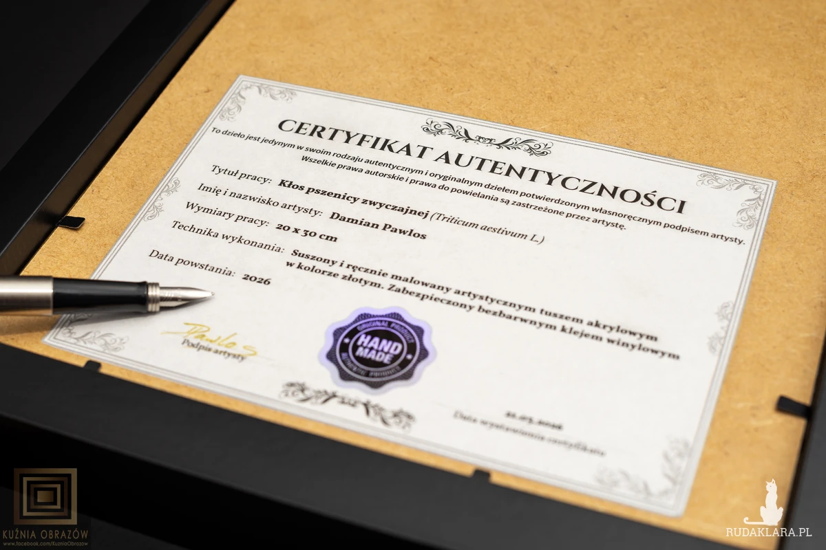 Prawdziwy kłos pszenicy został najpierw ususzony, po czym pomalowany ręcznie złotym tuszem artystycznym o wysokiej światłotrwałości, a na koniec zabezpieczony klejem winylowym, który zapewnia wytrzymałą, elastyczną powłokę odporną na kruszenie.