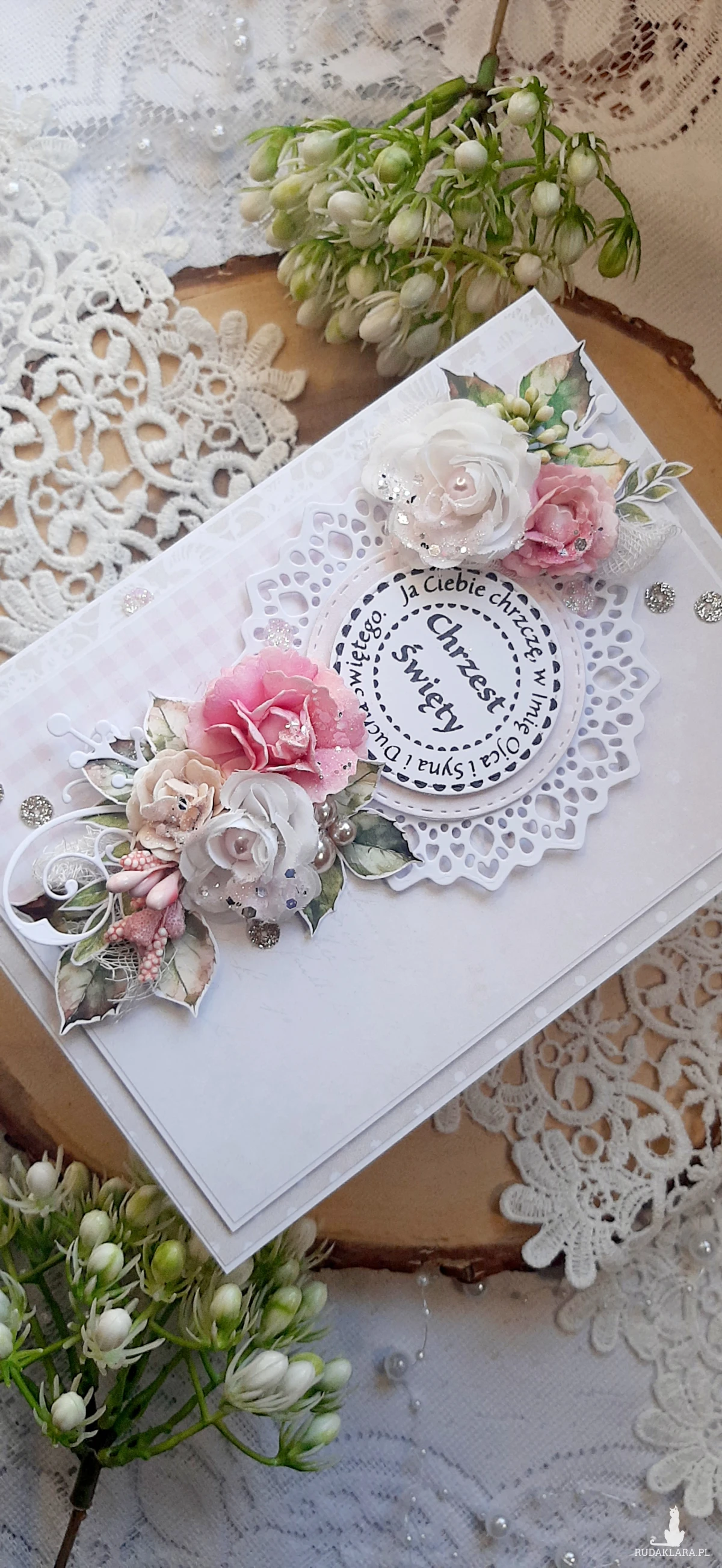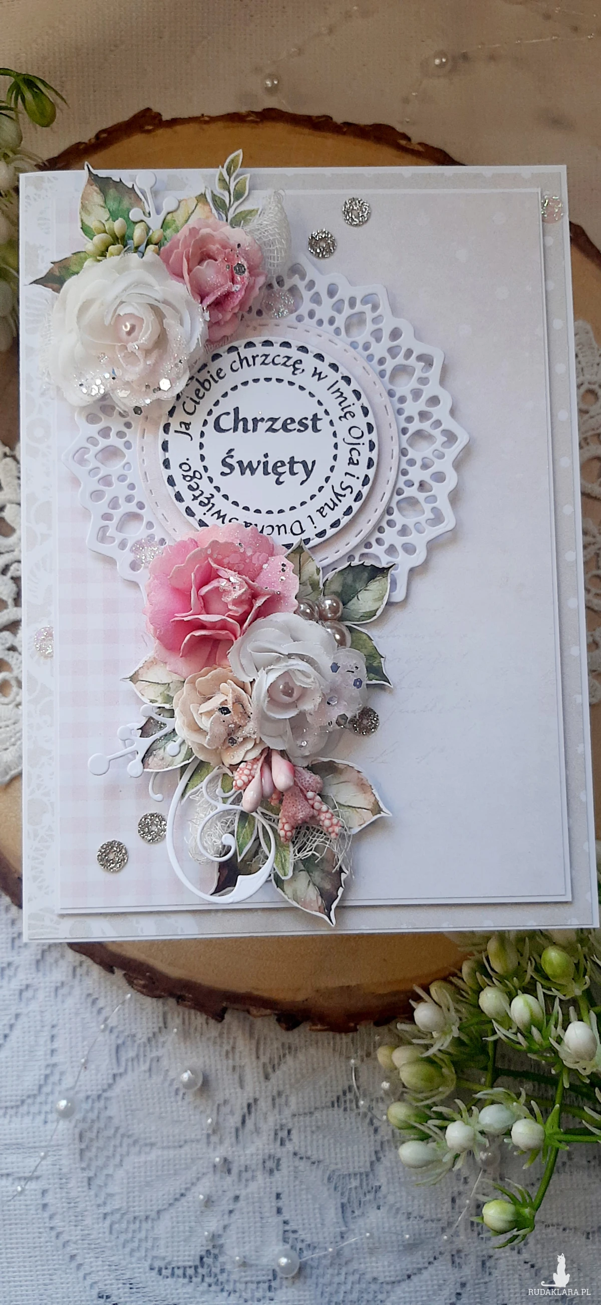 Kartka okolicznościowa do pudełka ma Chrzest Święty dla dziewczynki. Kartka jest bogato zdobiona kwiatami i innymi dodatkami. W środku kartka na życzenia podklejona taśmą dwustronną. Wymiary kartki 18x13 cm. W zestawie z pudełkiem o wymiarach 18,5x13,7x2,5 cm.