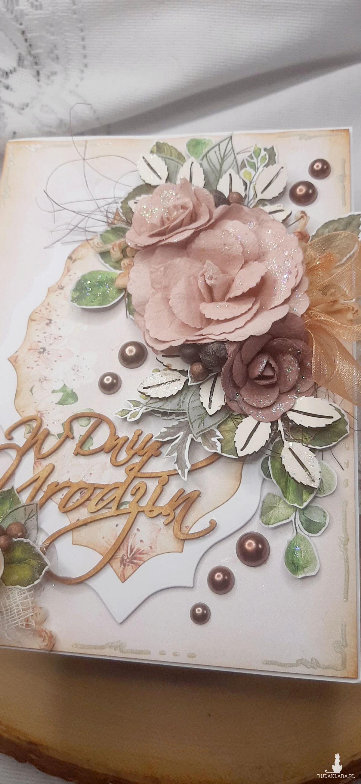 Kartka okolicznościowa do pudełka. Kartka jest bogato zdobiona kwiatami i innymi dodatkami. W środku kartka na życzenia podklejona taśmą dwustronną. Wymiary kartki 18x13 cm. W zestawie z pudełkiem o wymiarach 18,5x13,7x2 cm.