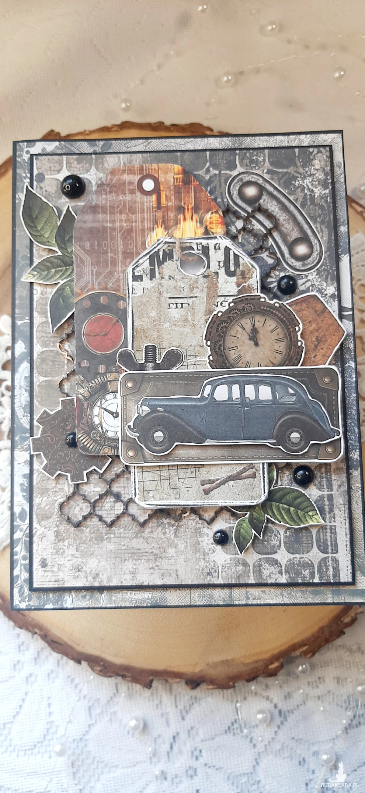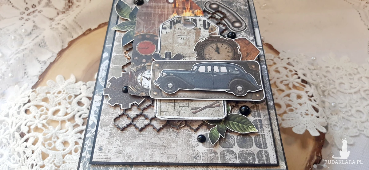 Kartka okolicznościowa do pudełka. Kartka jest bogato zdobiona różnymi "męskimi" dodatkami. W środku kartka na życzenia podklejona taśmą dwustronną. Wymiary kartki 18x13 cm. W zestawie z pudełkiem o wymiarach 18,5x13,7x2,5 cm.