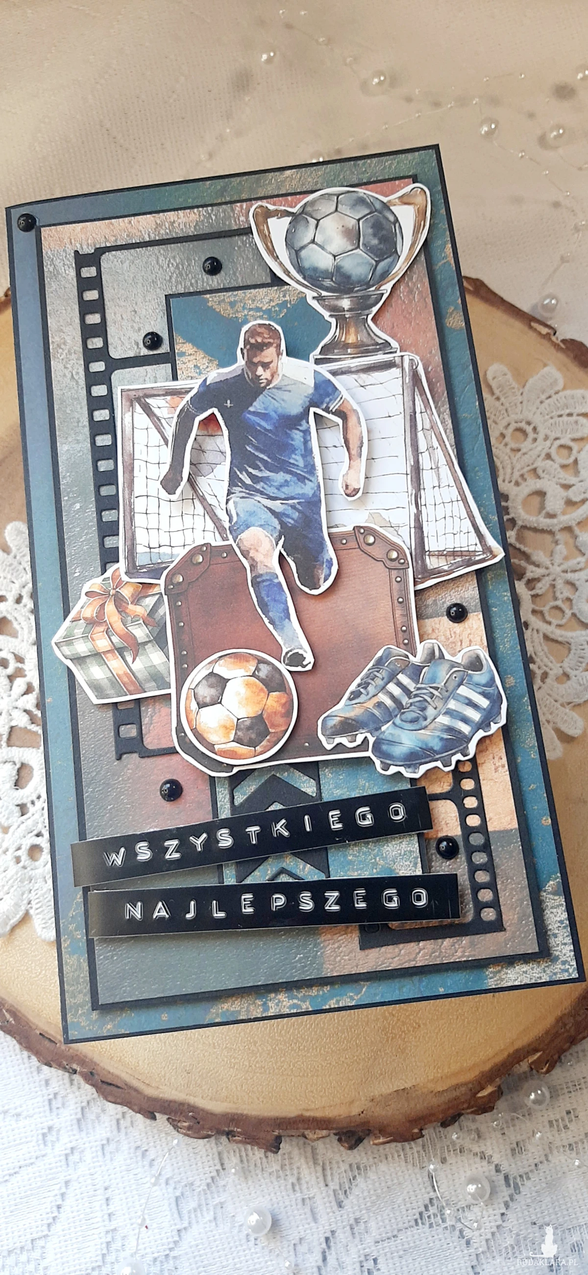 Kartka okolicznościowa do pudełka. Kartka jest bogato zdobiona różnymi "męskimi" dodatkami. W środku kartka na życzenia podklejona taśmą dwustronną. Wymiary kartki 20x11 cm. W zestawie z pudełkiem o wymiarach 20,5x11,5x2 cm.
