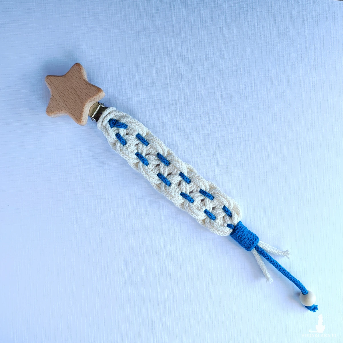 Wykonana techniką makramy ze sznurków bawełnianych z certyfikatem Standard 100 by OEKO-TEX w klasie I (co oznacza, że są bezpieczne i mogą być stosowane w produktach dla niemowląt i dzieci do lat 3) i klipsa z nielakierowanego drewna bukowego.
