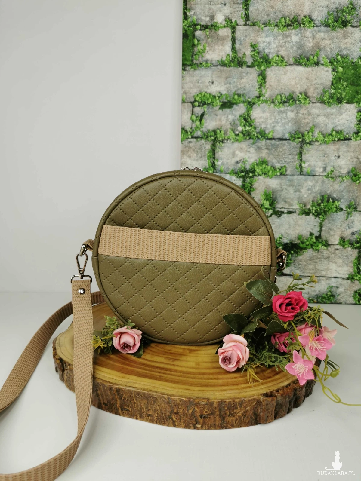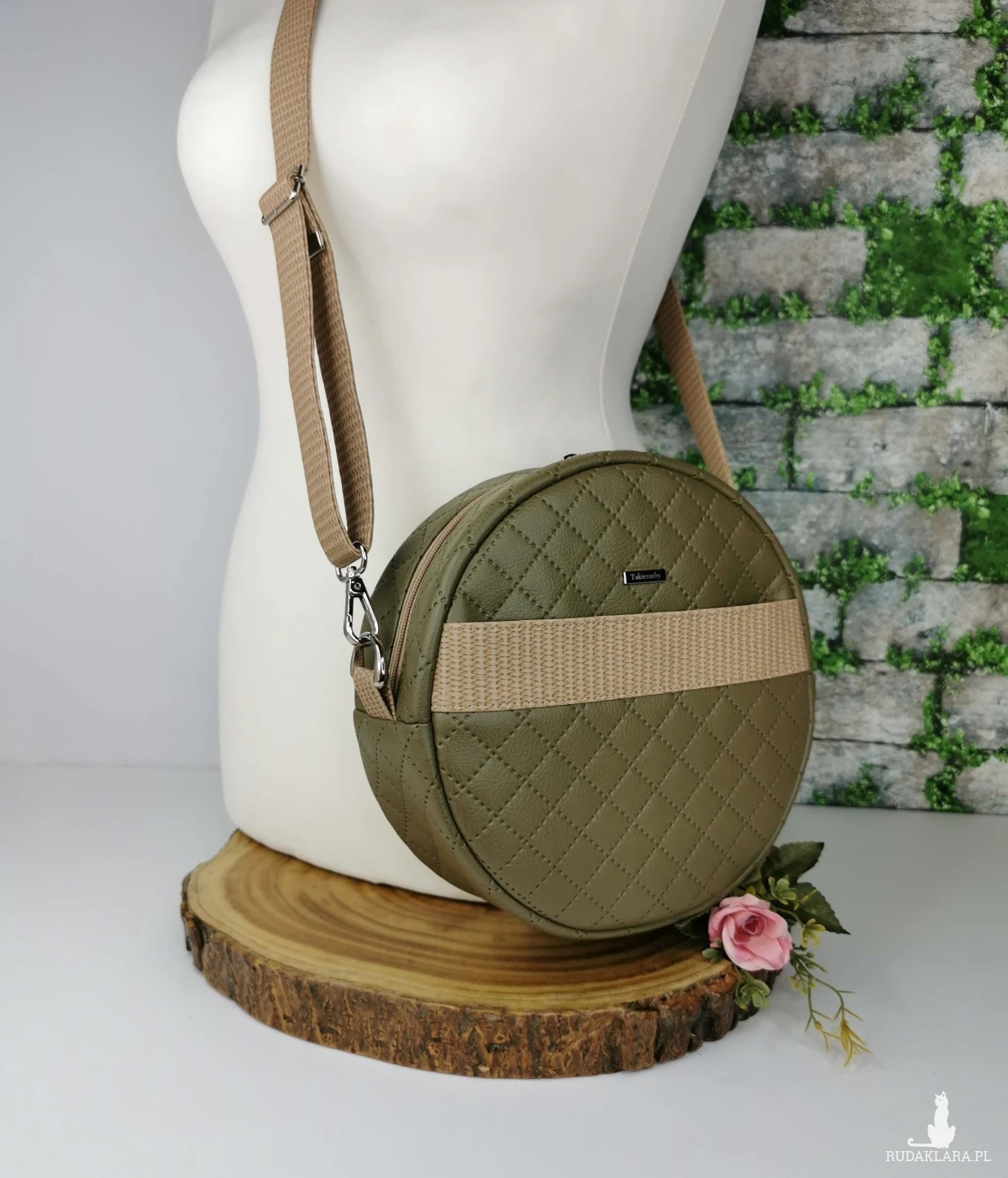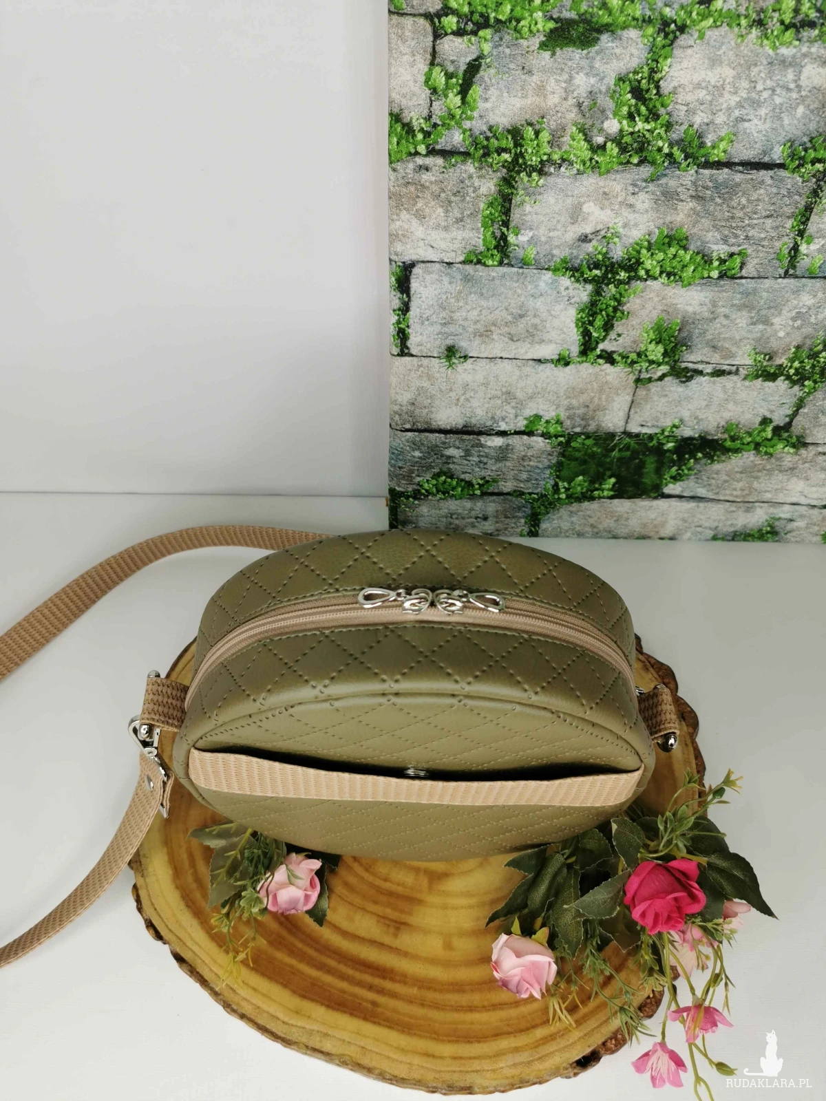 Torebka zapinana na zamek. Wykonana z ekoskóry pikowanej w kolorze zielonym/ khaki , z dodatkiem ekoskóry w kolorze beżowym. Na przodzie oraz tyle torebki kieszeń zapinana na zapięcie magnetyczne.