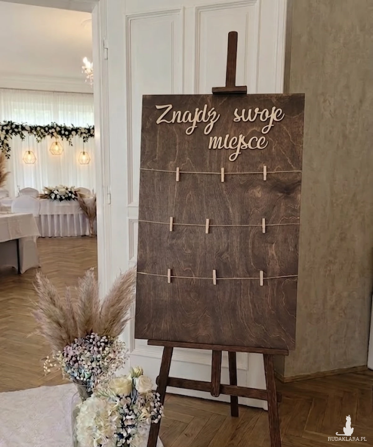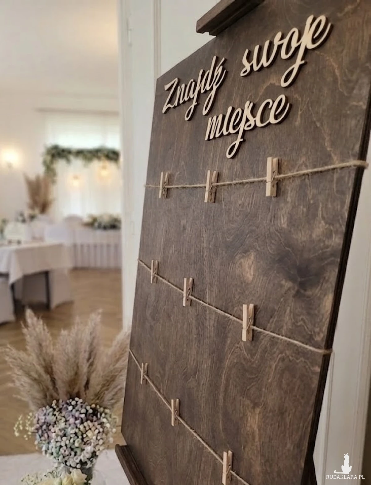 Format 60 × 40 cm zapewnia czytelność i odpowiednią przestrzeń na rozmieszczenie listy gości oraz oznaczeń stołów, jednocześnie pozostając subtelnym dodatkiem do wystroju. Naturalna struktura drewna podkreśla charakter stylu boho i rustykalnego, tworząc spójną całość z dekoracjami opartymi na motywach roślinnych, lnianych tkaninach czy suszonych kwiatach.