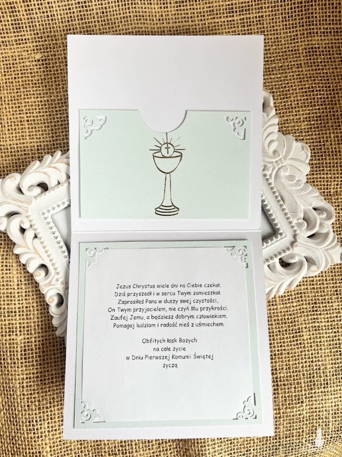 Ręcznie wykonana kartka na Pierwszą Komunię Świętą w komplecie z przyozdobioną kopertą -