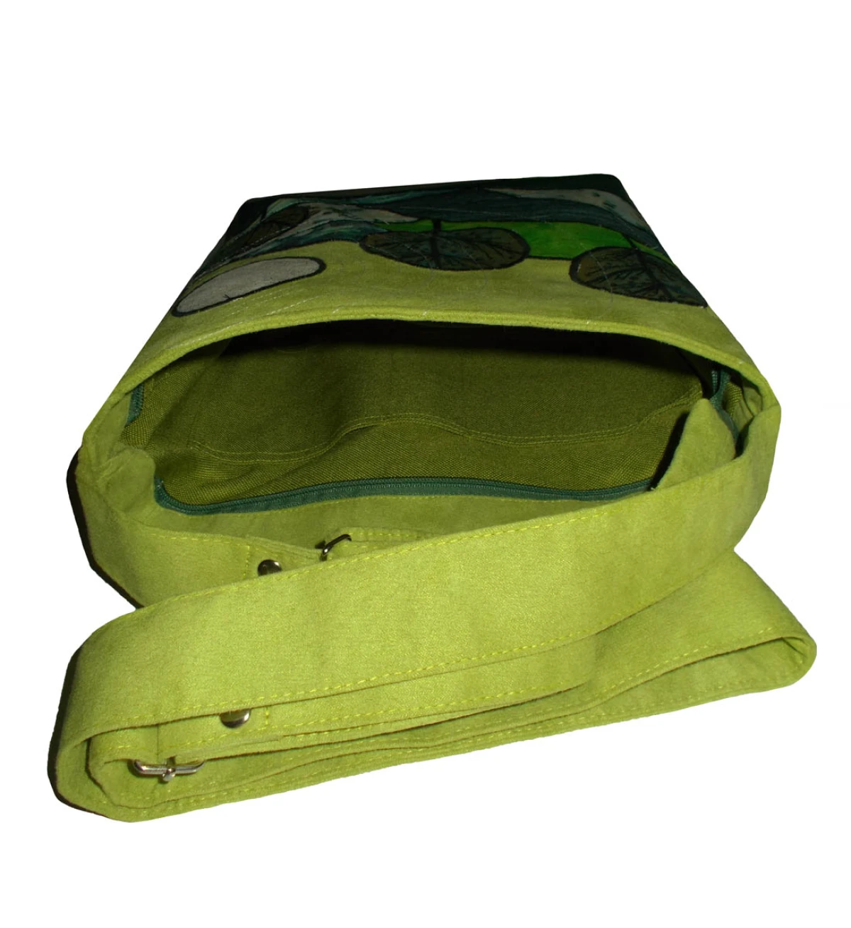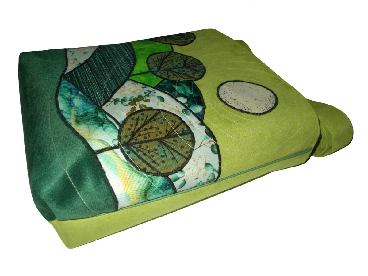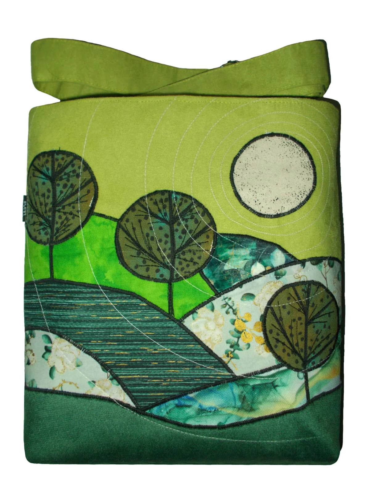 NIEPOWTARZALNA, jedna jedyna, autorska torba z eko zamszu. Tył torby w kolorze paska. Pasek z tego samego materiału co całość, z regulacją, wzmocniony nitami, okucia srebrne. Przód zdobią aplikacje układające się w niepowtarzalny pejzaż. Cała torba trzyma kształt. W szwach wypustka. Denko poszerzone. Całość zapinana na zamek. Jedna z wewnętrznych kieszeni jest również zapinana na zamek. Druga kieszeń pomieści telefon, długopis i notesik. szerokość 32cm, wysokość 30cm plus denko 8cm
