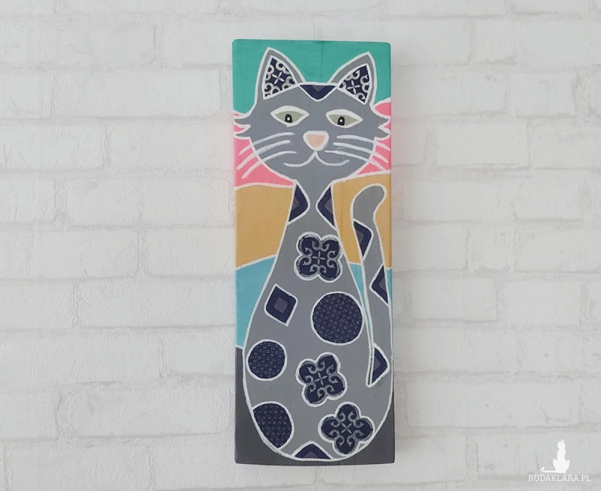 wykonany na lekko oszlifowanej desce, a wizerunek kota został ozdobiony w