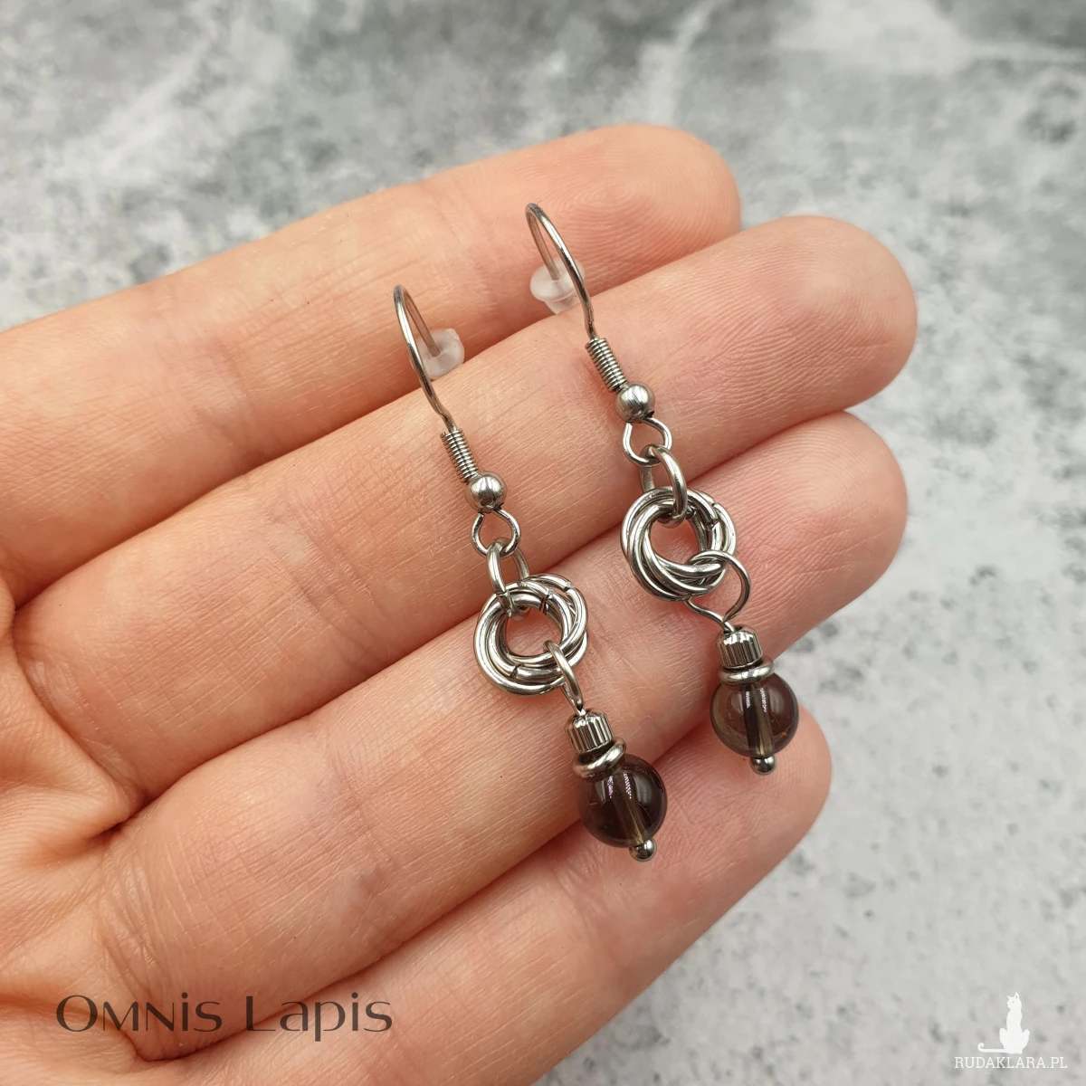 Kolczyki wykonane w stylu chainmaille, polegającym na łączeniu ze sobą ogniwek w taki sposób, aby tworzyły kreślony splot. Kolczyki ozdobione kulami kwarcu dymnego.