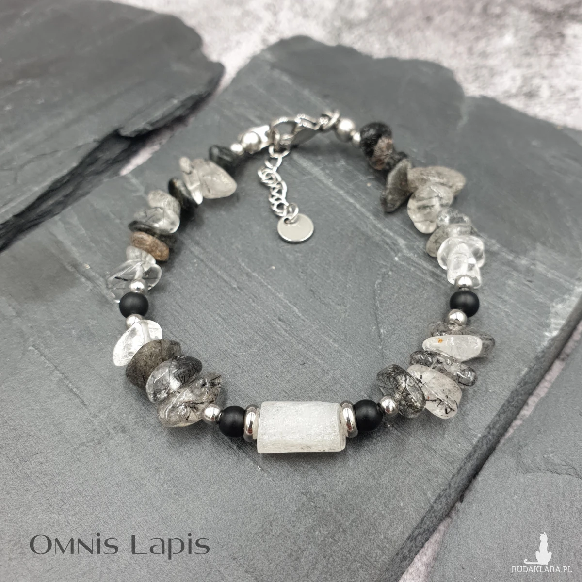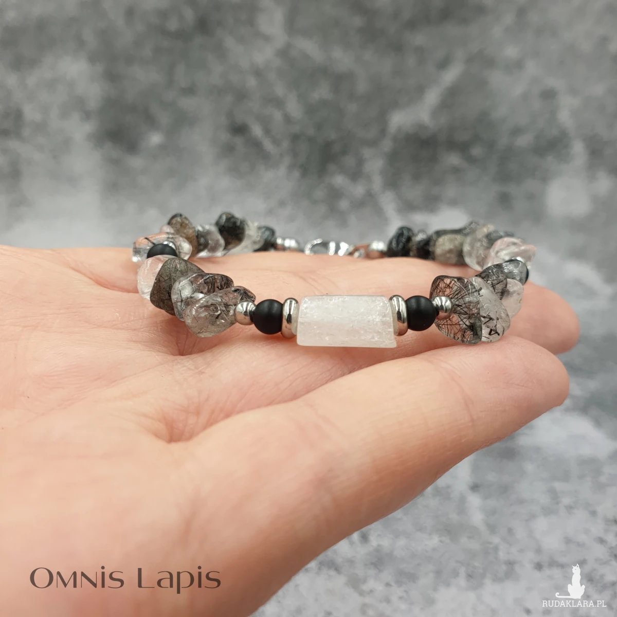 Bransoletka w kolorze czerni i bieli. Wykonana z nieregularnych koralików kwarcu z turmalinem. Centrum bransoletki stanowi wałek z białego cytrynu, przedzielony stalowymi oponkami i kulkami matowego onyksu.