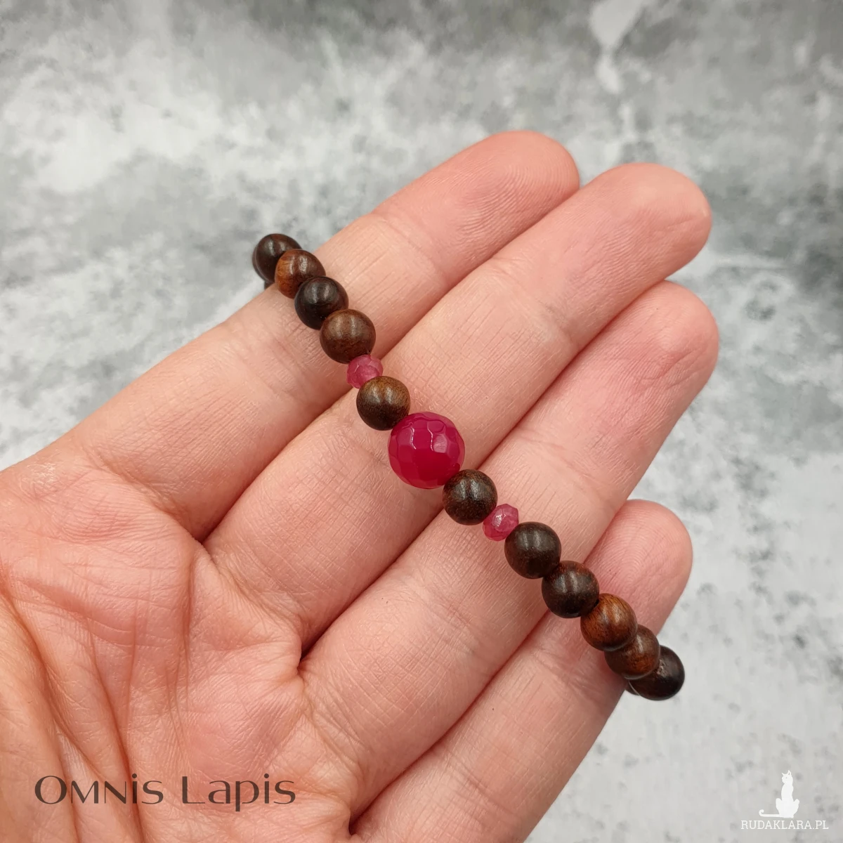 Wykonana z kul naturalnego drewna egzotycznego oraz oponek i kuli jadeitu fuksja.