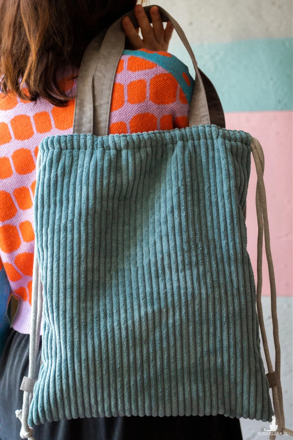 Plecakotorba worek 2w1 wykonana z grubego sztruksu w kolorze niebieskim w połączeniu z szarym nubukiem.