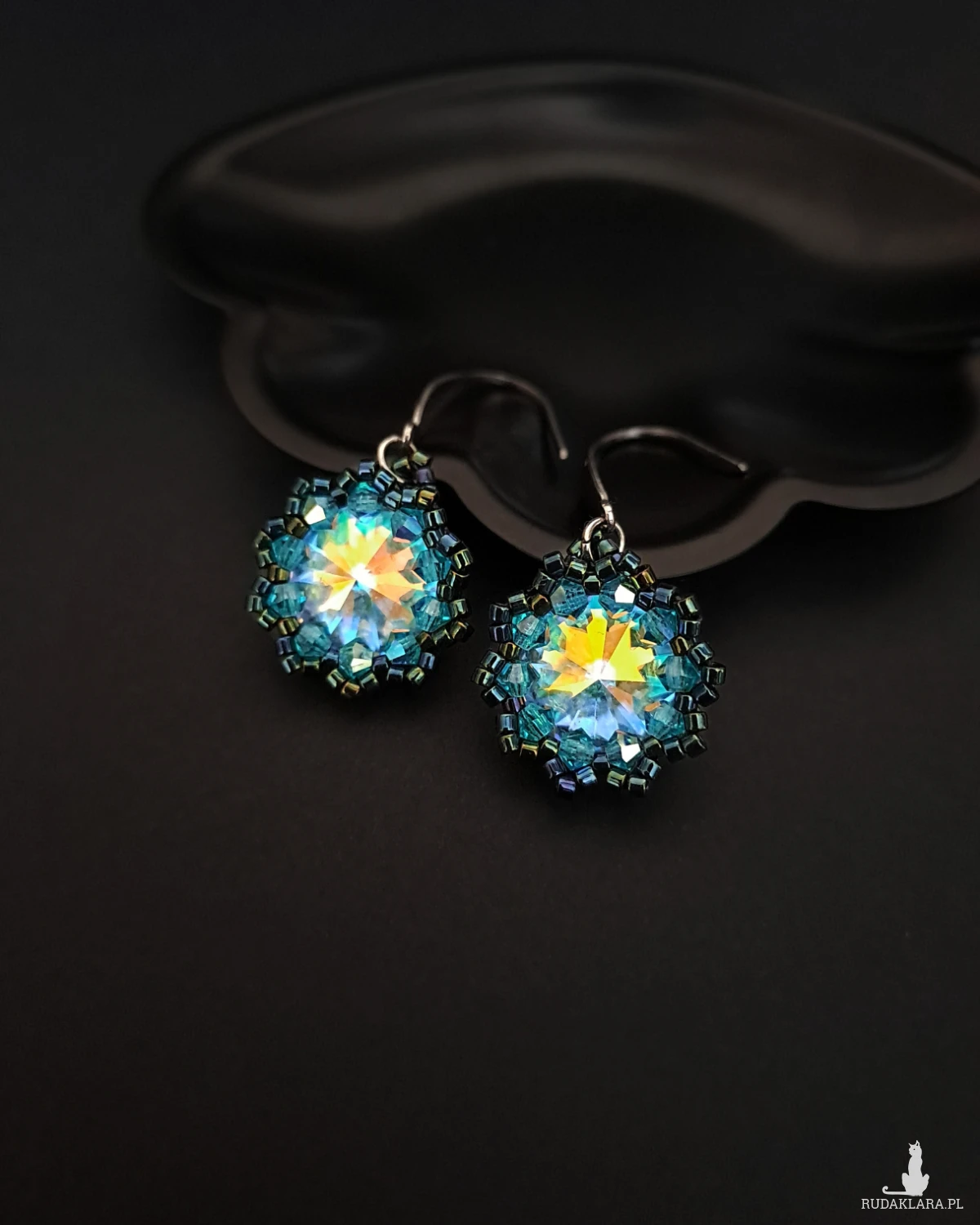 Centralnym elementem kolczyków są kamienie Preciosa Rivoli Maxima o średnicy 12 mm w odcieniu Crystal AB - krystalicznie jasnym, opalizującym na chłodne błękity, zielenie oraz ciepłe, złote refleksy. Ich intensywny blask zmienia się w zależności od światła, nadając biżuterii niepowtarzalnej głębi.