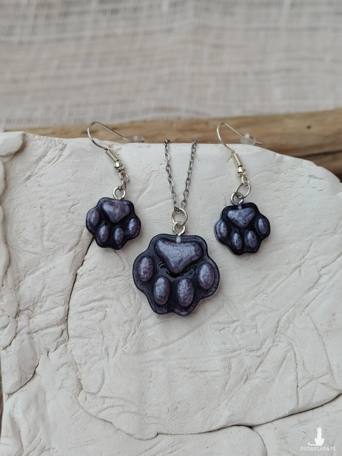 Delikatny i uroczy komplet biżuterii inspirowany miłością do zwierząt. Naszyjnik oraz kolczyki w kształcie psiej łapki zachwycają subtelnym, fioletowym odcieniem z lekko perłowym połyskiem. To idealny dodatek dla miłośników psów i osób, które lubią biżuterię z charakterem. Komplet jest lekki i wygodny w noszeniu, dzięki czemu sprawdzi się zarówno na co dzień, jak i jako wyjątkowy akcent do casualowych stylizacji. Świetny pomysł na prezent dla każdej osoby kochającej czworonogi.