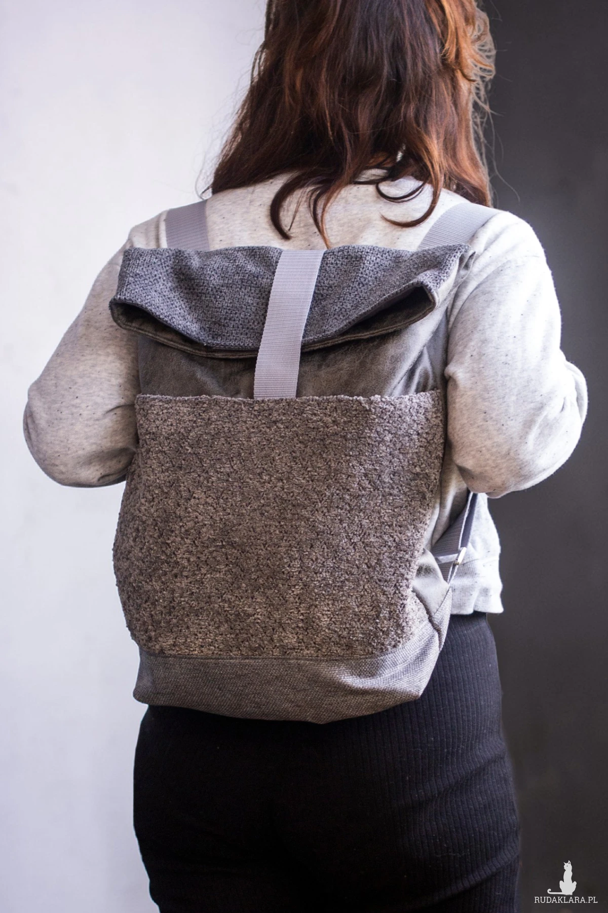 Duży plecak miejski składany i zapinany na rzep wykonany z kilku rodzajów tkanin.