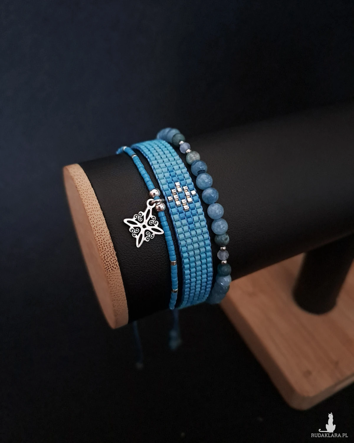 - Bransoletka z kamieni: akwamaryn i apatyt, drobne przekładki ze stali nierdzewnej.