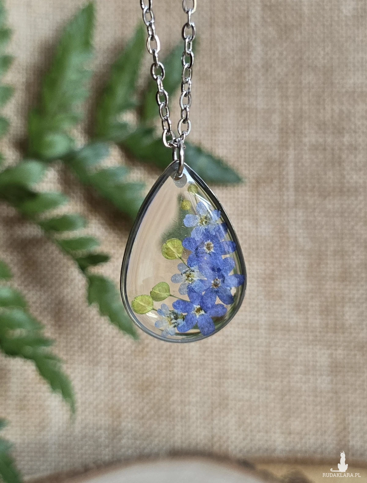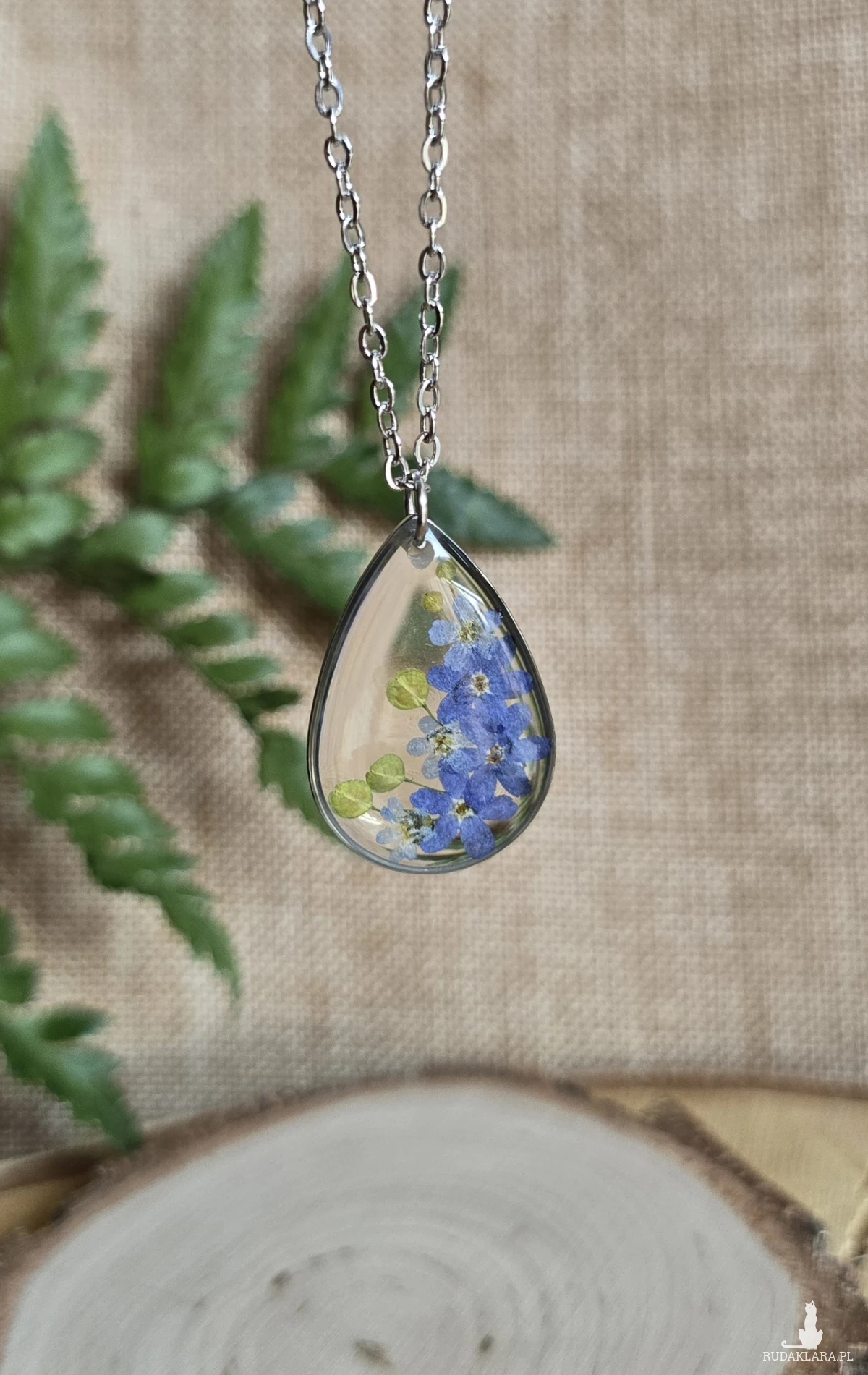 Oferuję Państwu unikalną biżuterię. Zawieszka jest wykonana z suszonych kwiatów i żywicy epoksydowej. Biżuteria jest wspaniałym i oryginalnym prezentem na lata.