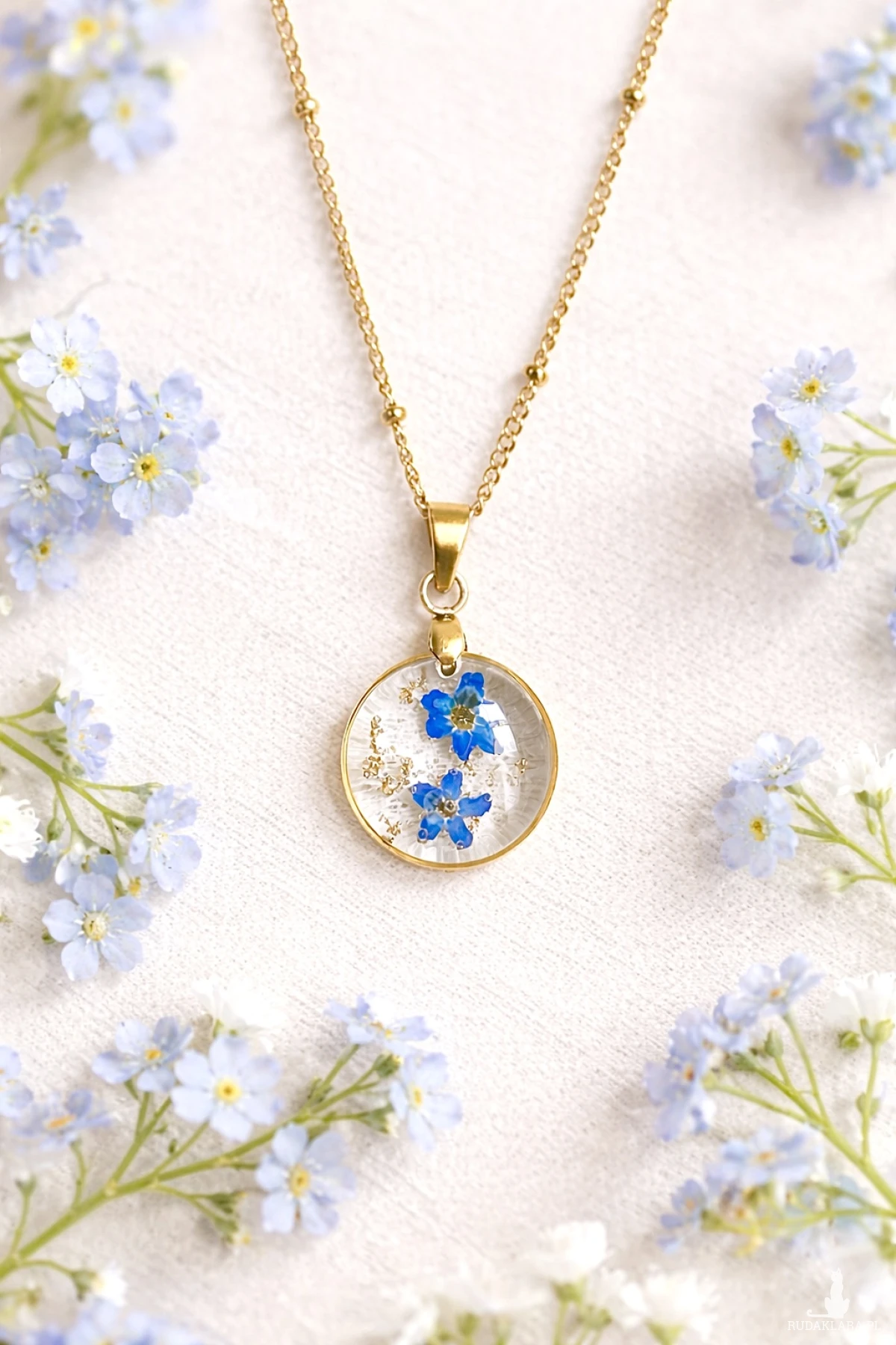 Wyjątkowy naszyjnik z prawdziwymi niezapominajkami zatopionymi w krystalicznie przejrzystej żywicy. Delikatne niebieskie kwiaty zostały ręcznie ułożone w okrągłej zawieszce, która przypomina szkło i pięknie odbija światło.