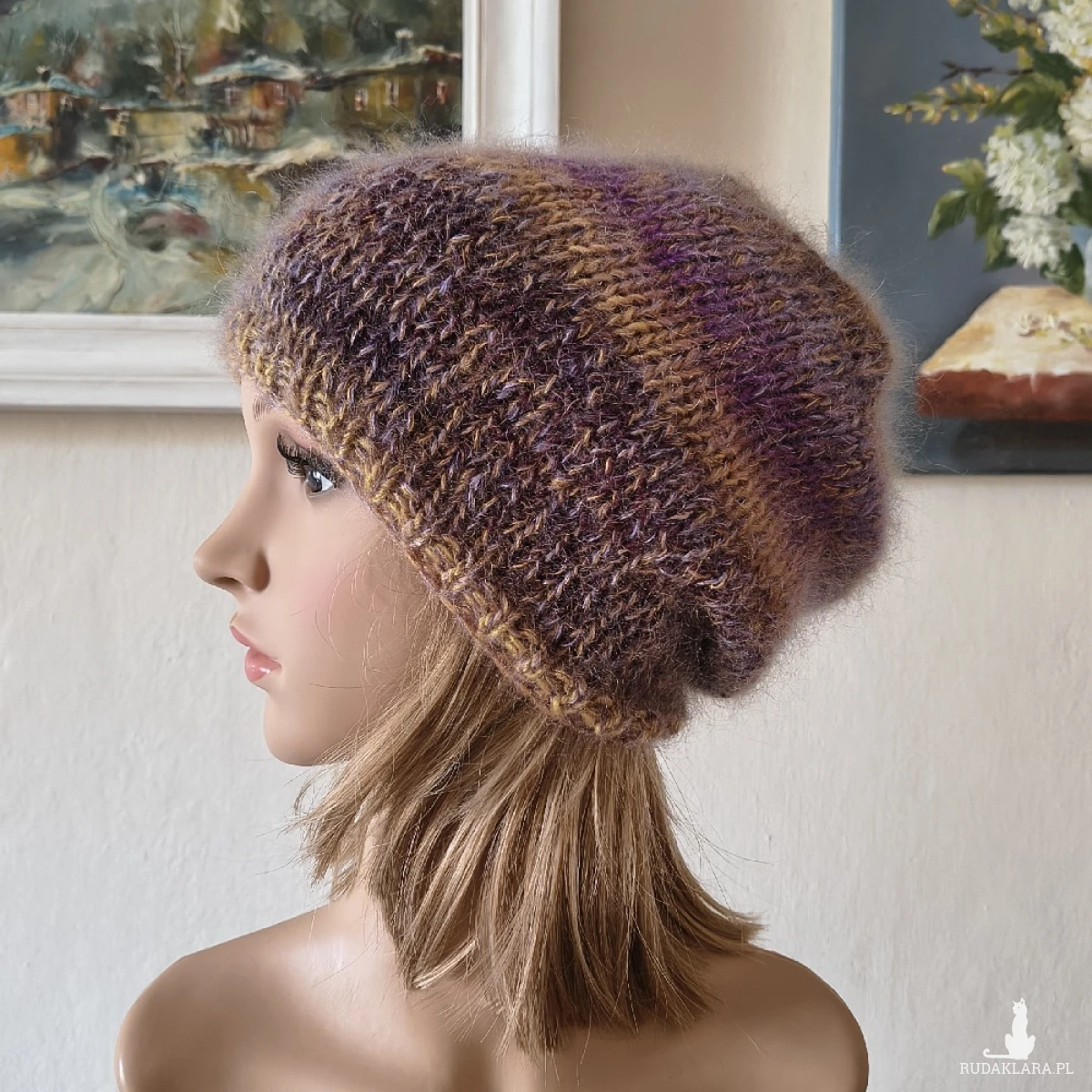 Miła, ciepła, puchata, lekka czapka wykonana ręcznie na drutach potrójną nitką z doskonałych włóczek o składzie: jedwab, najdelikatniejszy moher i ekskluzywna wełenka merino. Czapka nie jest typem grubaśnej czapy, ale bardzo ciepła. Zdjęcia nie oddają miękkości i delikatności włóczek. Polecam dla obwodów głowy 56-58 cm, wys. 27 cm. Brak klasycznego ściągacza nie grozi rozciągnięciem czapki.