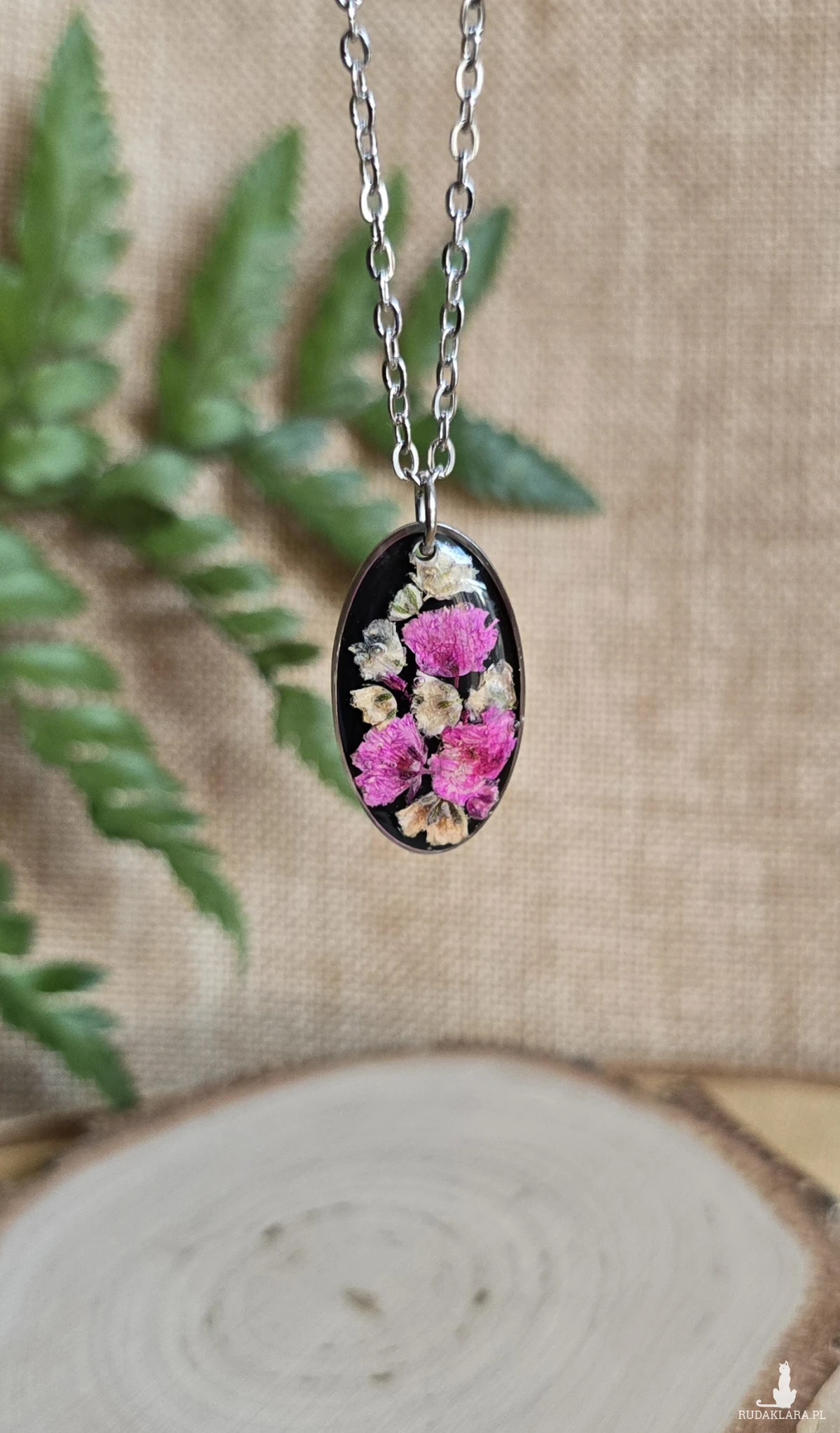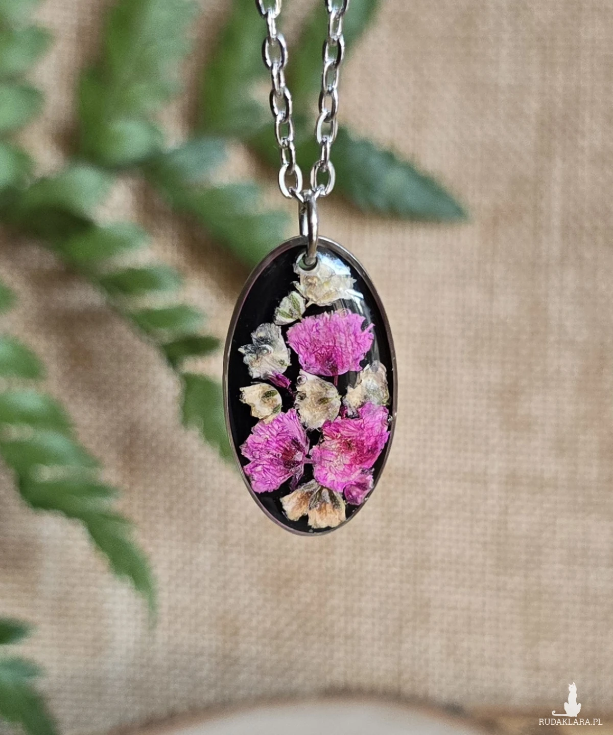 Oferuję Państwu unikalną biżuterię. Zawieszka jest wykonana z suszonych kwiatów i żywicy epoksydowej. Biżuteria jest wspaniałym i oryginalnym prezentem na lata.
