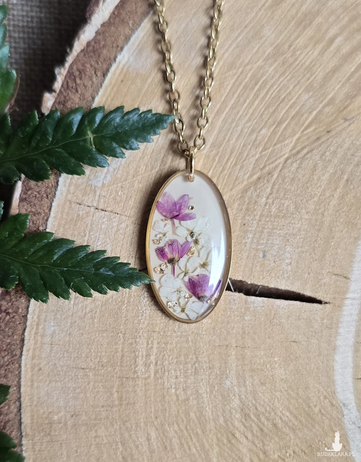 Oferuję Państwu unikalną biżuterię. Zawieszka jest wykonana z suszonych kwiatów i żywicy epoksydowej. Biżuteria jest wspaniałym i oryginalnym prezentem na lata.