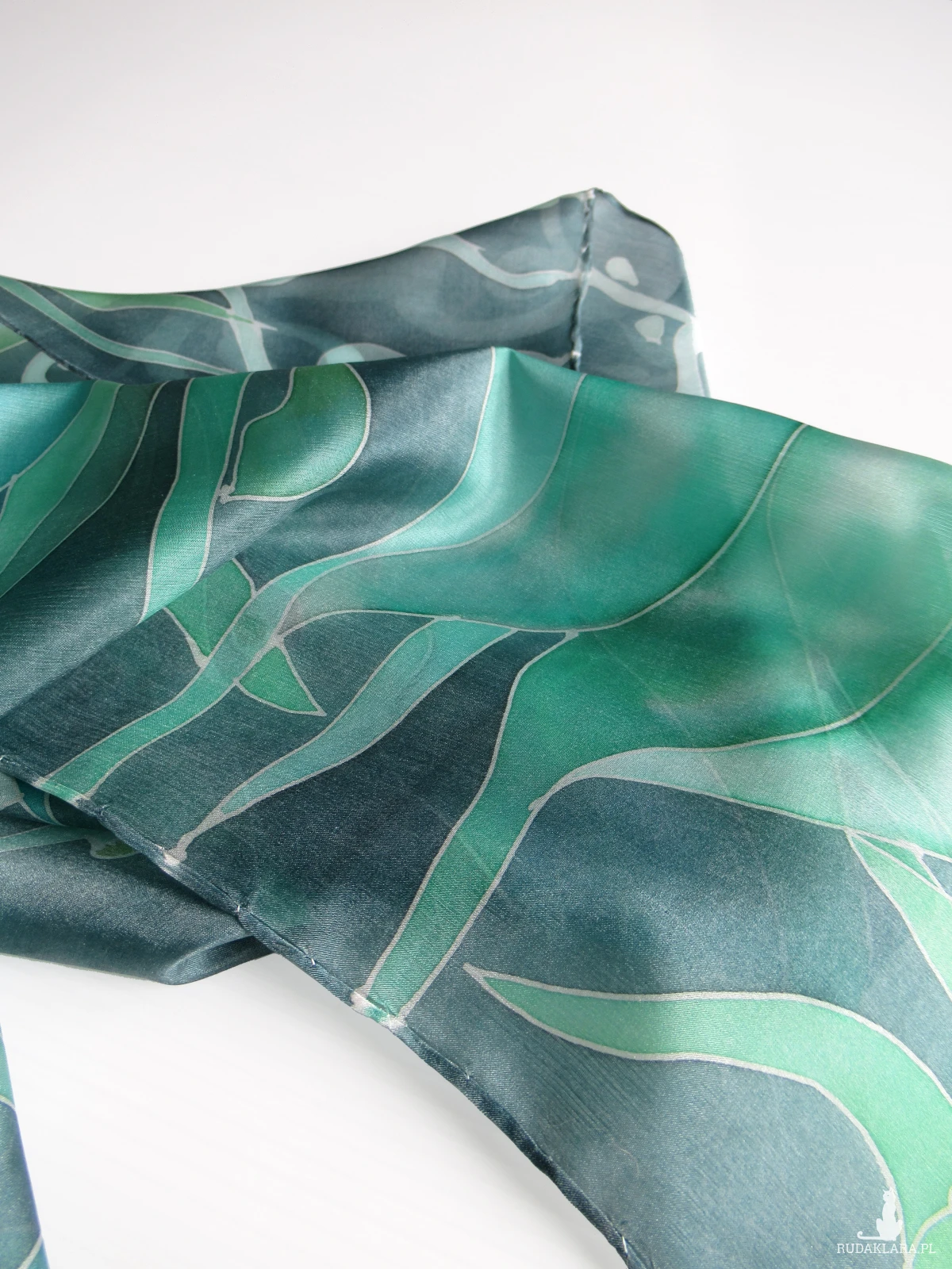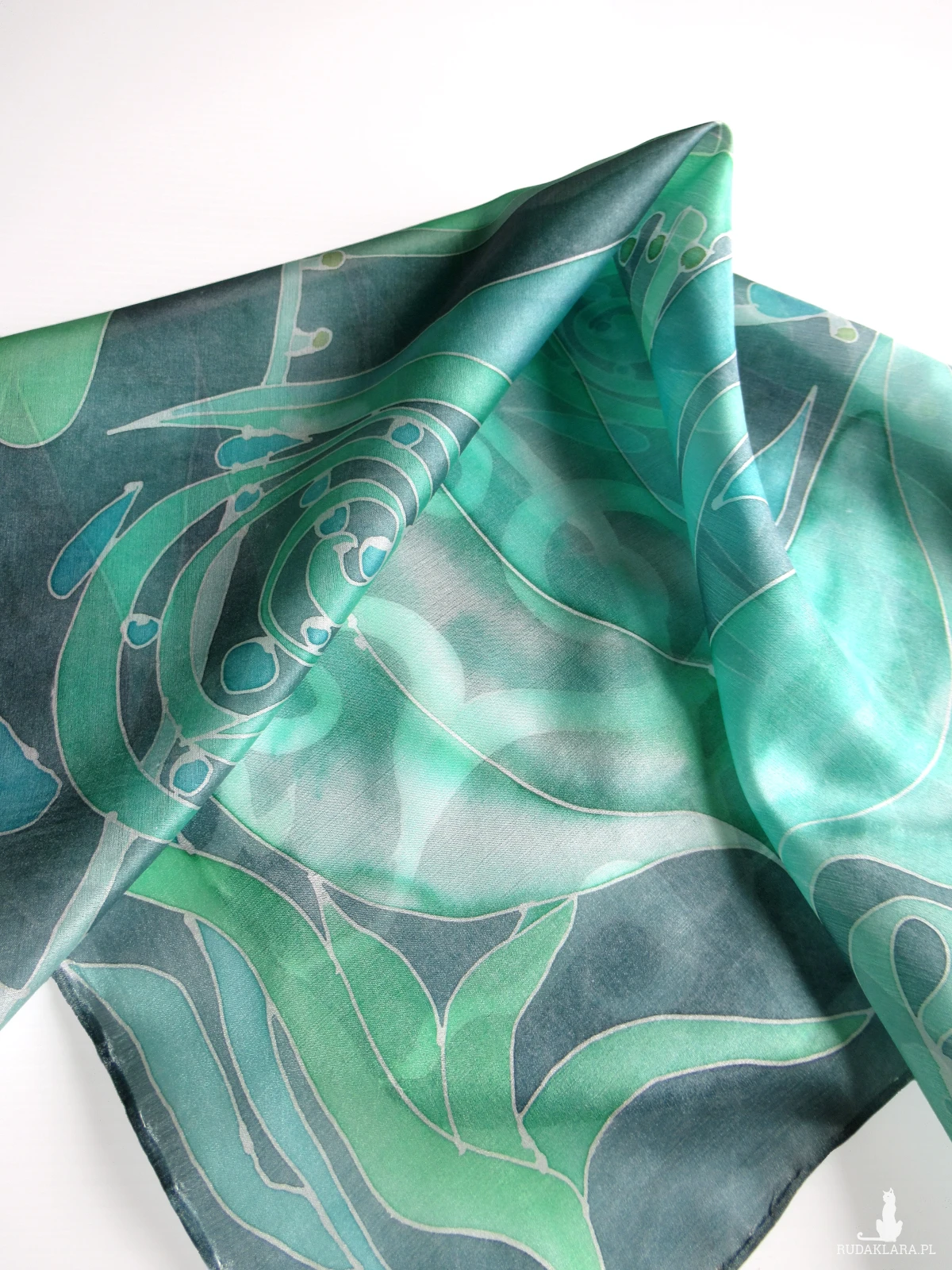 Jedwabna ręcznie malowana apaszka Zielona z dekoracją roślinną.