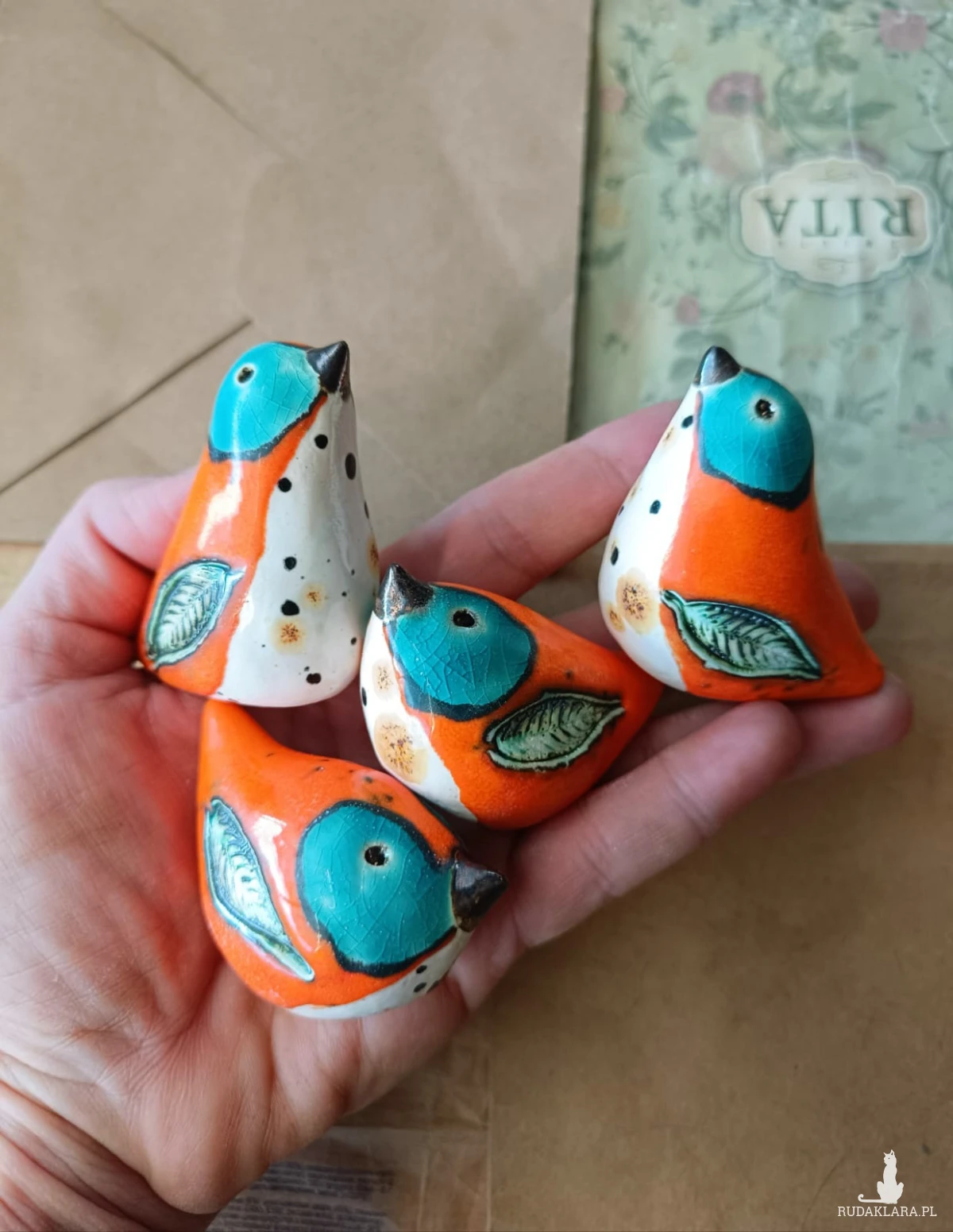 Ptaszki ceramiczne wykonane z gliny szamotowej, wypalone na biskwit, a następnie szkliwione w temp ok 1260 stopni C. O wymiarach ok 5-6 cm. Serdecznie polecam. Dostępne również w pojedynczych egzemplarzach.