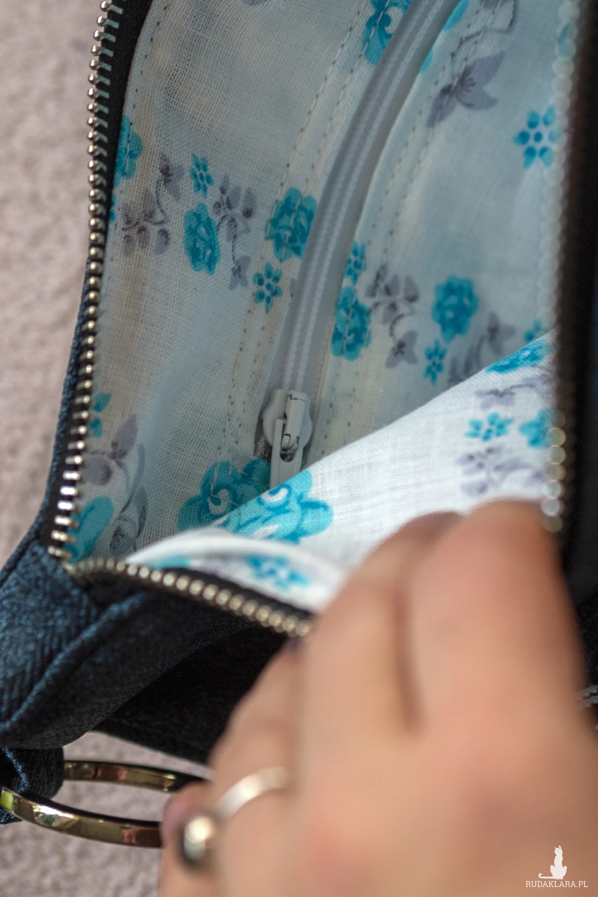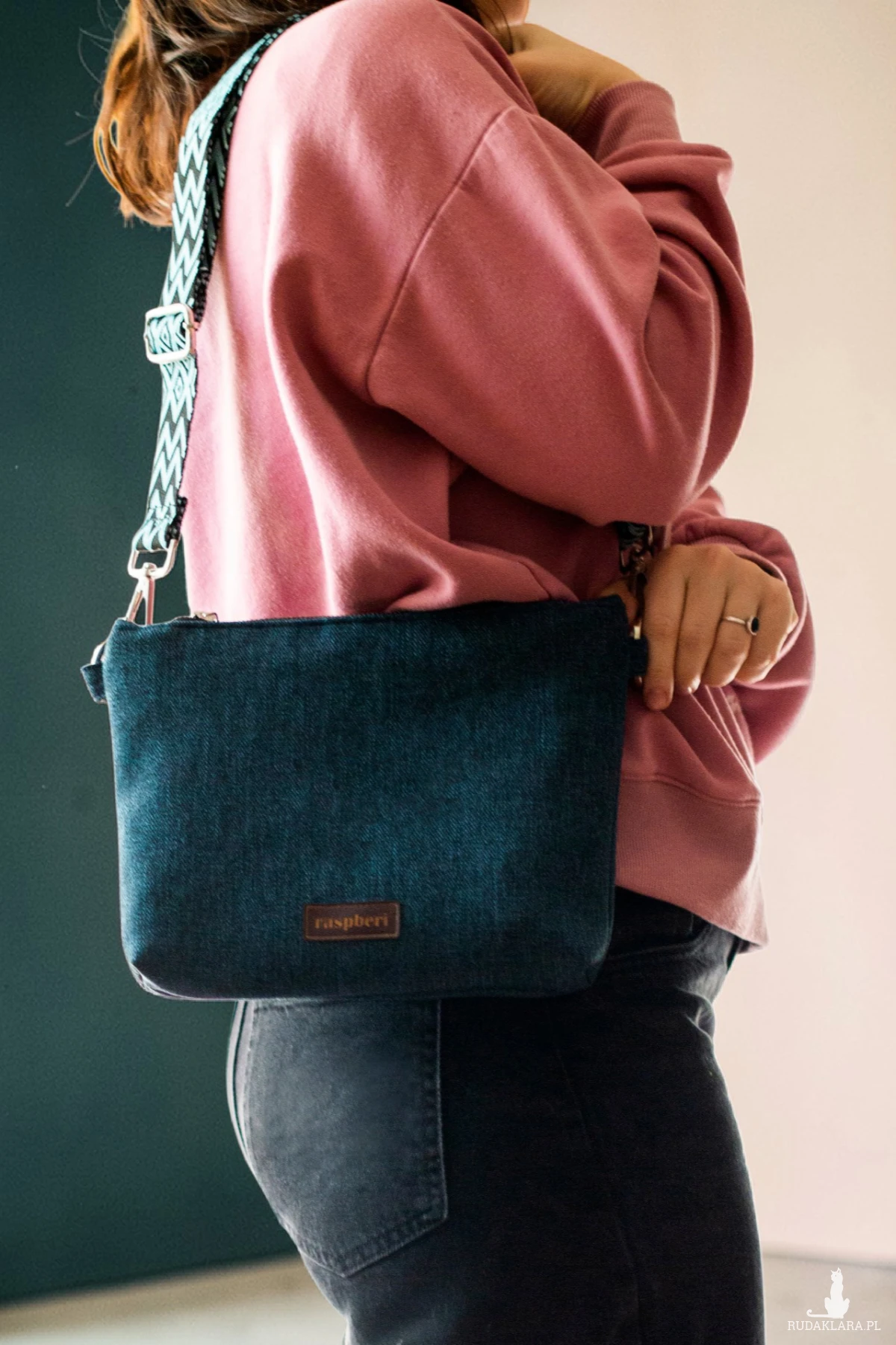 Prosta torebka, kopertówka w średnim rozmiarze wykonana z tkaniny w kolorze granatowym. Zapinana na suwak.Wymiary to 21x27cm.Małe zaszewki na dnie. Z tyłu oraz w środku torebki kieszonki zapinane na suwak. Środek wykończony białą bawełnianą podszewką.Torebka posiada regulowany, niebiesko-czarny pasek w zygzaki i srebrne okucia.