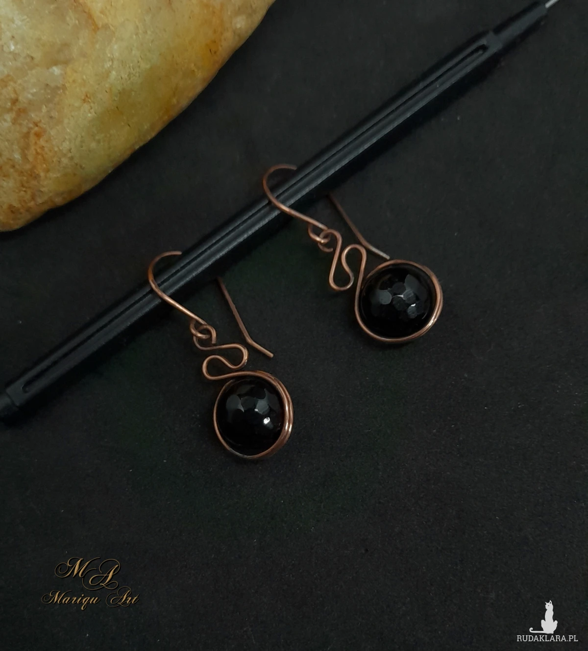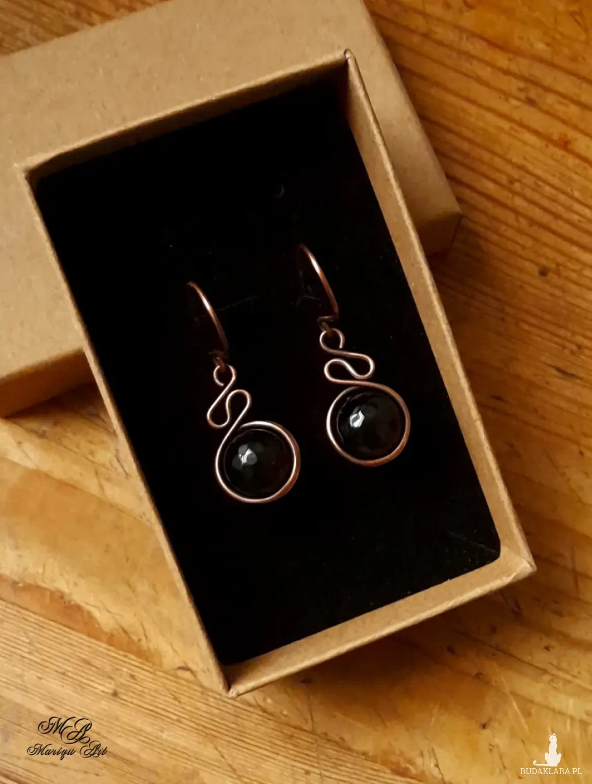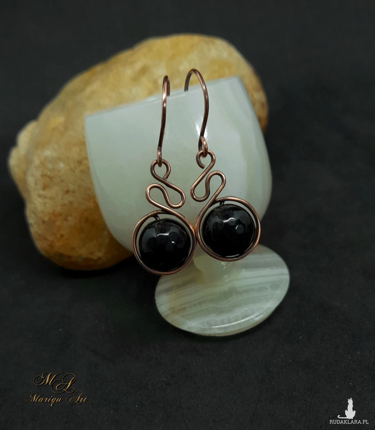 Piękne kolczyki wykonane ręcznie z fasetowanego czarnego jadeitu, oplecione oksydowaną miedzią, która podkreśla naturalne piękno kamienia. Subtelny, artystyczny skręt drutu dodaje kolczykom lekkości i wyjątkowego charakteru.