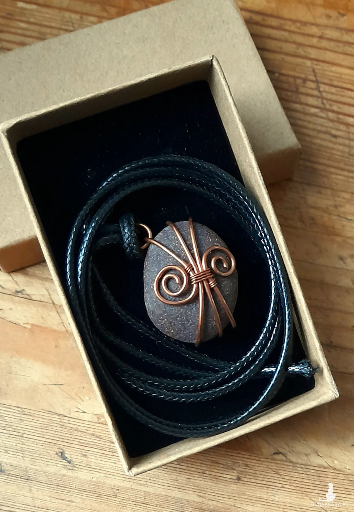 Unikatowy, naturalny kamień znaleziony nad brzegiem morza, starannie oprawiony w nieoksydowaną miedź metodą wire wrapping. Kamień ma wymiary 2,5 cm x 2 cm, a całość zawieszona jest na bawełnianym woskowanym sznurku, co podkreśla jego naturalny charakter. Idealny jako subtelny akcent codziennej biżuterii lub wyjątkowy prezent dla miłośników natury.