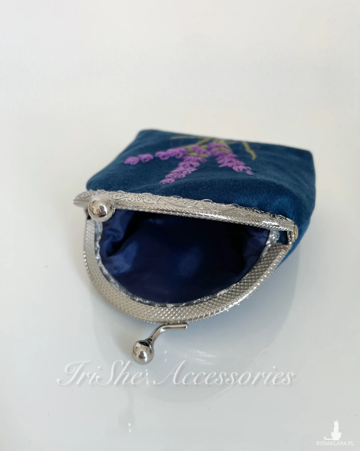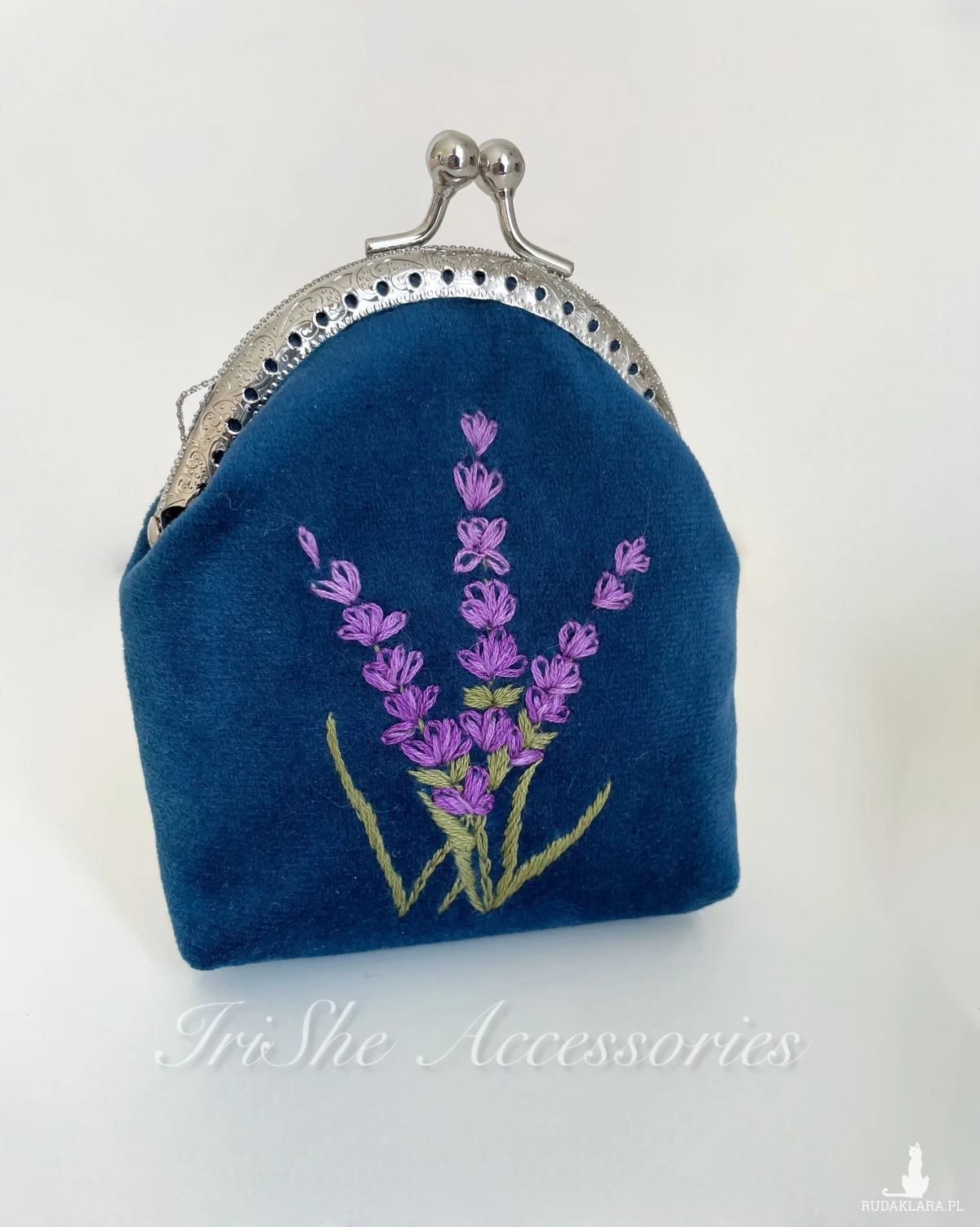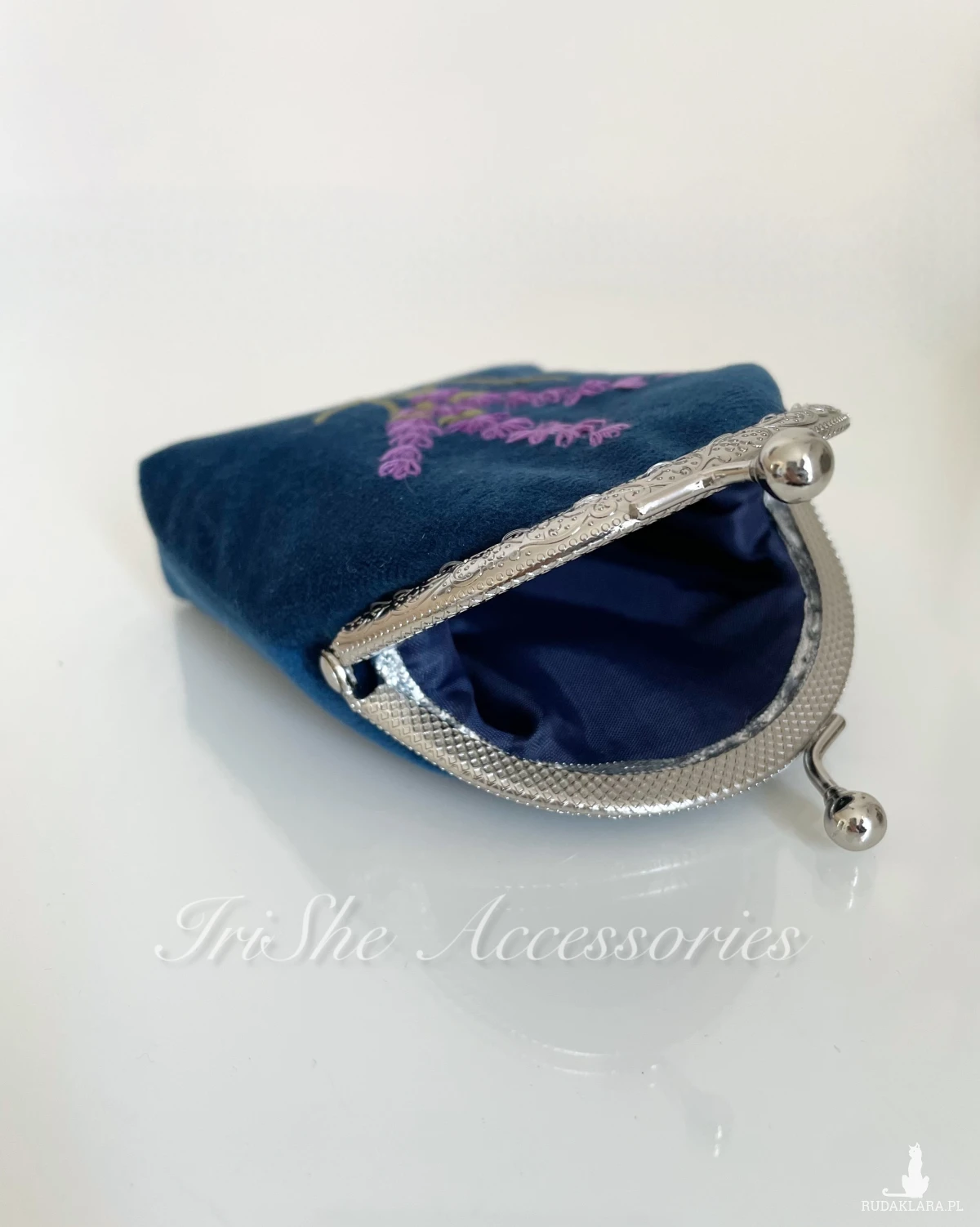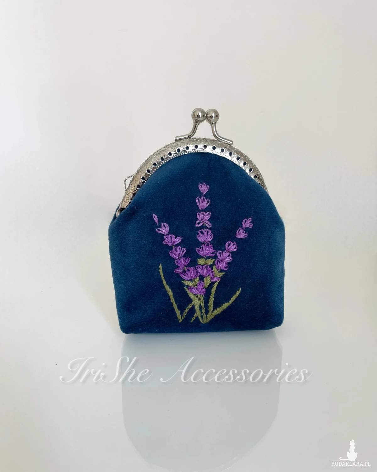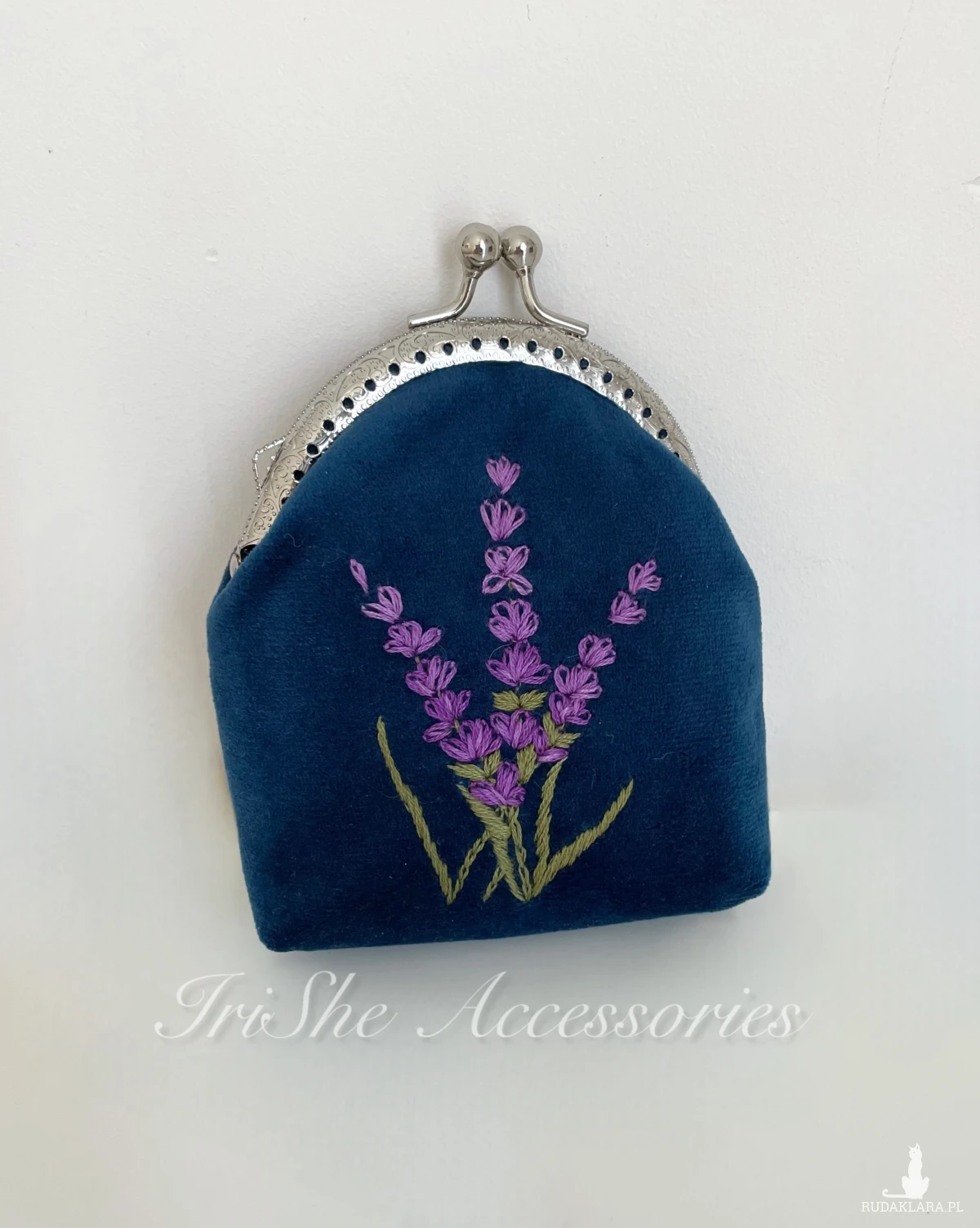 Granatowa portmonetka "Lawenda" z autorskiej kolekcji portmonetek haftowanych – własnoręcznie uszyta i haftowana, wyjątkowo lekka i miękka, doskonała na każdą okazję.