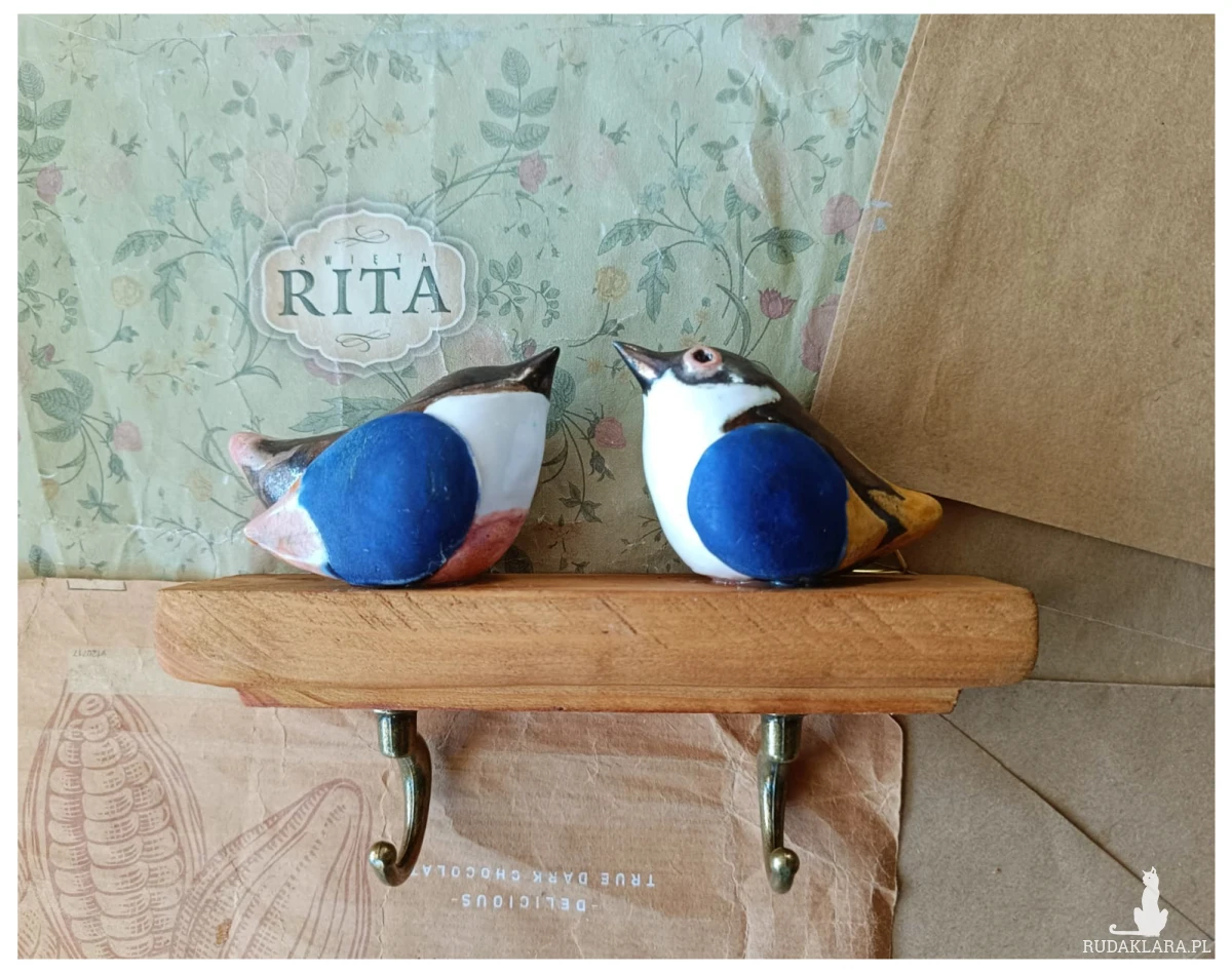 Wieszak z ceramicznymi dodatkami, wykonany z gliny szamotowej wypalony na biskwit, a następnie szkliwiony w temp. ok 1260 stopni C. Wymiary ok 15 cm z parą ptaszków. Idealne do ozdoby domu lub jako prezent okolicznościowy. Serdecznie polecam!!!