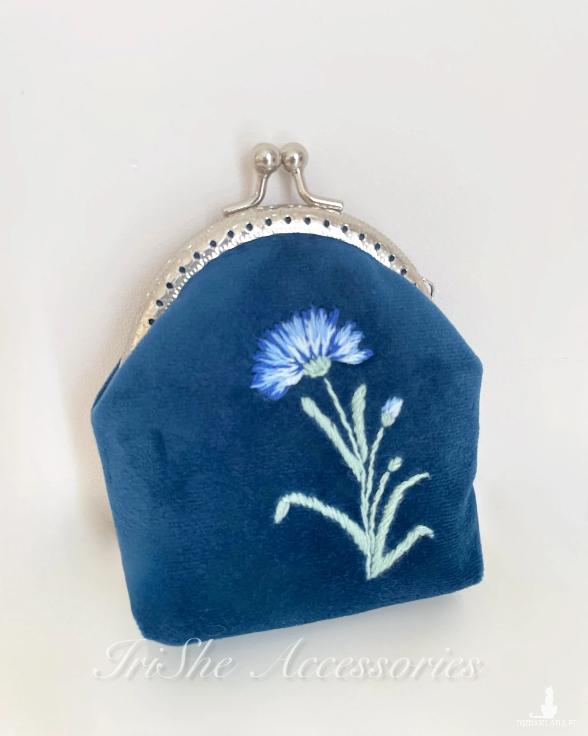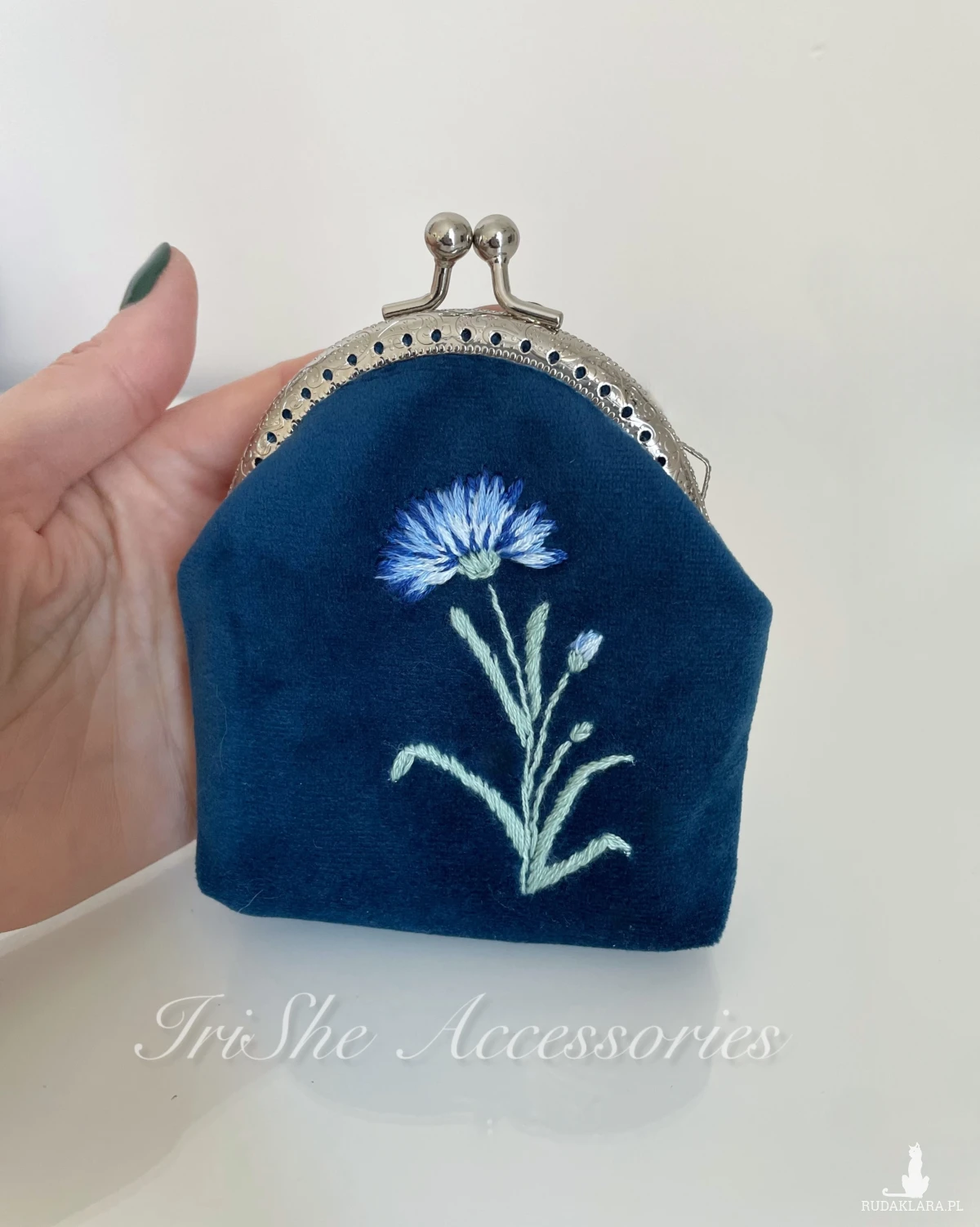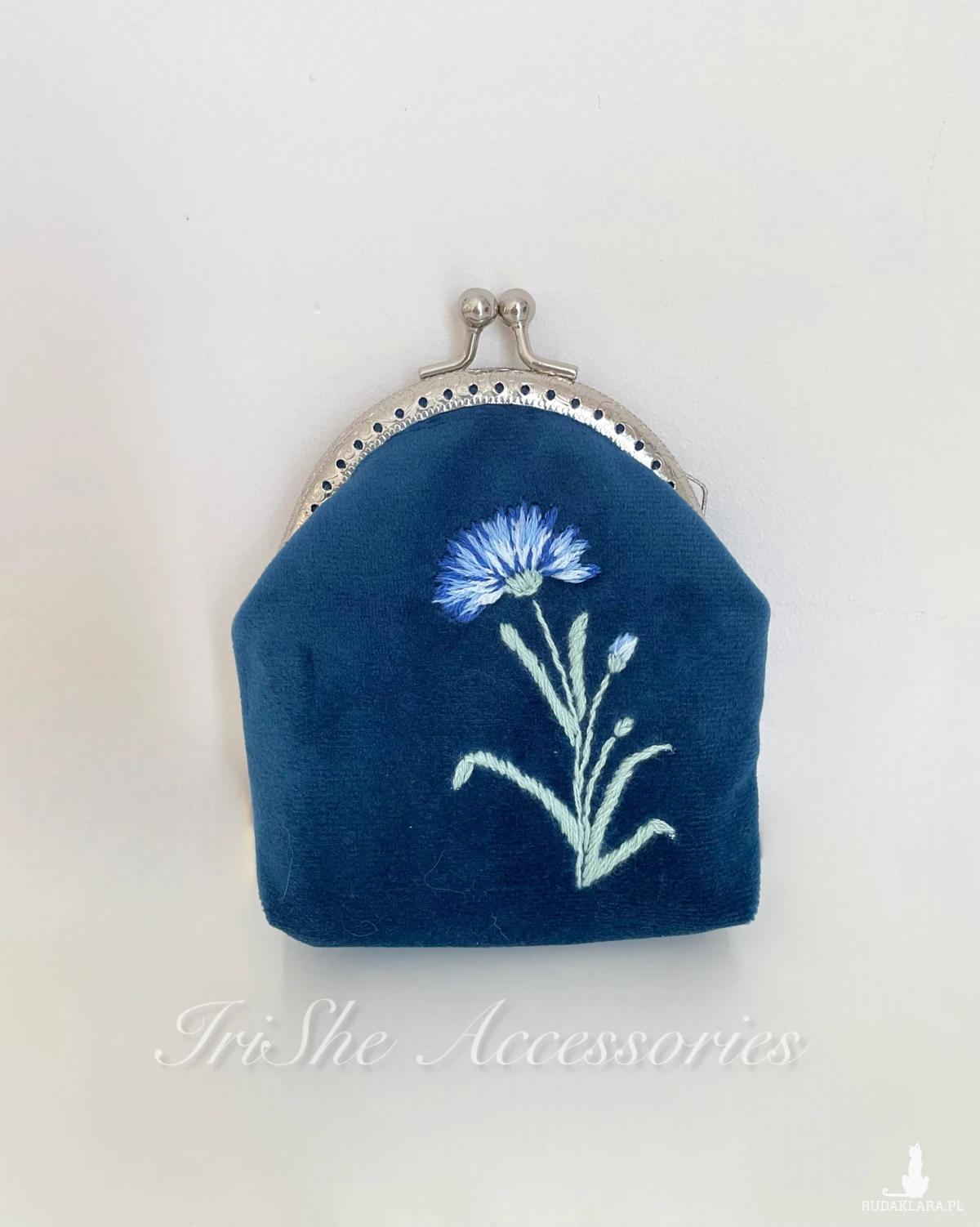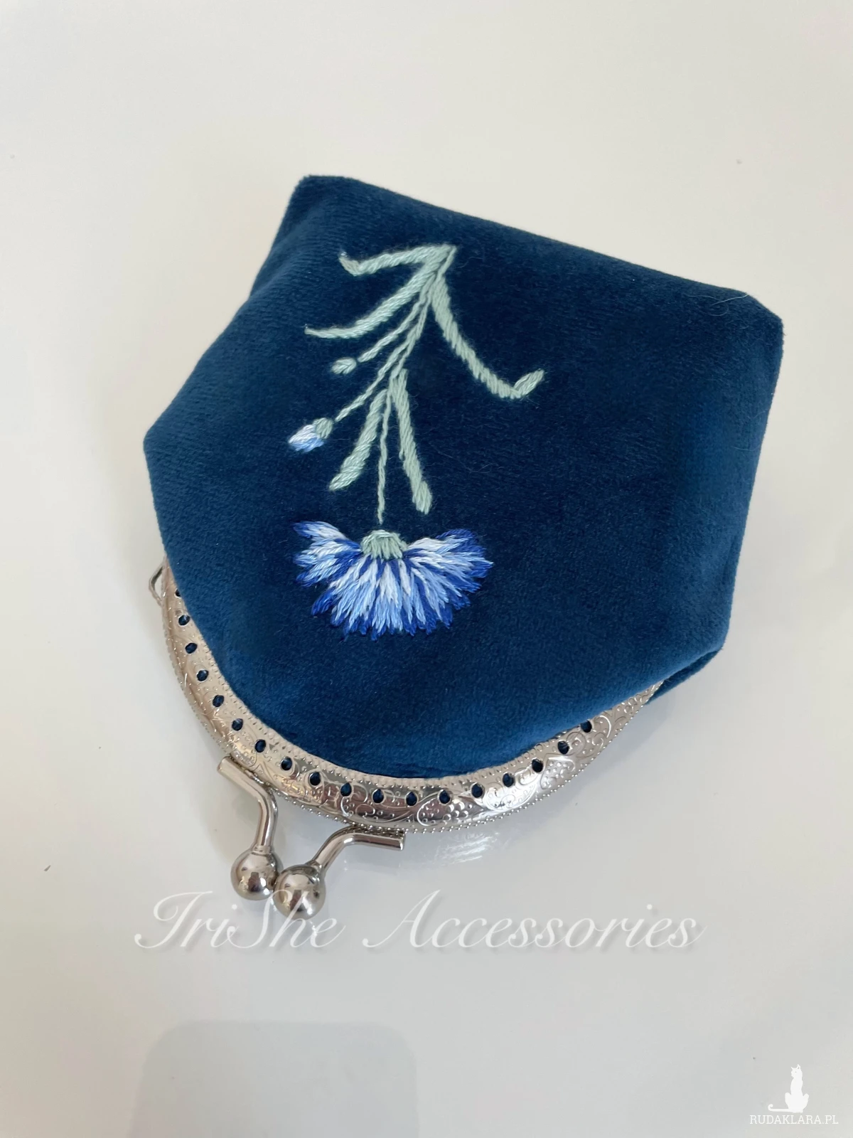 Granatowa portmonetka "Chaber" z autorskiej kolekcji portmonetek haftowanych – własnoręcznie uszyta i haftowana, wyjątkowo lekka i miękka, doskonała na każdą okazję.