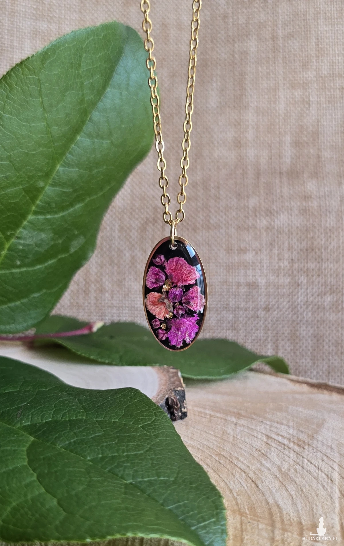 Oferuję Państwu unikalną biżuterię. Zawieszka jest wykonana z suszonych kwiatów i żywicy epoksydowej. Biżuteria jest wspaniałym i oryginalnym prezentem na lata.