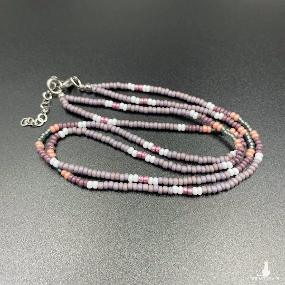 Krótki naszyjnik ( złożony z dwóch sznurów ) został wykonany ręcznie ze szklanych koralików 2,7 - 3 mm w kolorze bladej lawendy, białym, szarym, odcieniach różu. Elementy metalowe ze stali chirurgicznej.