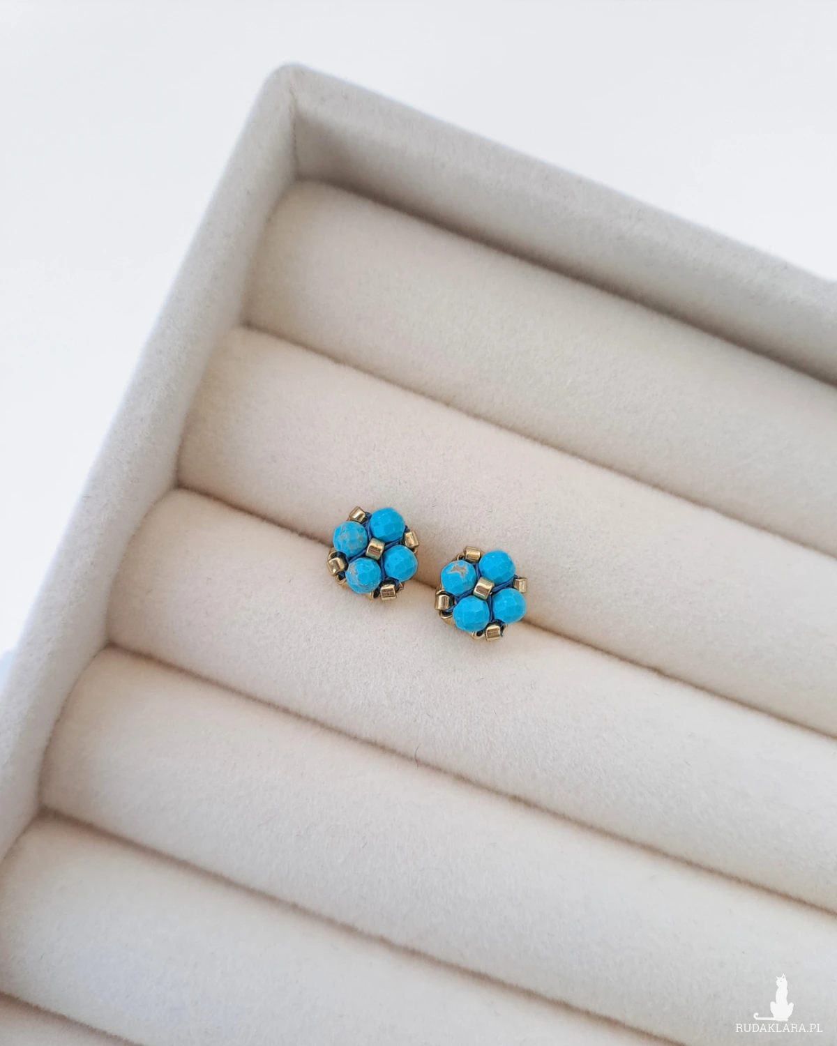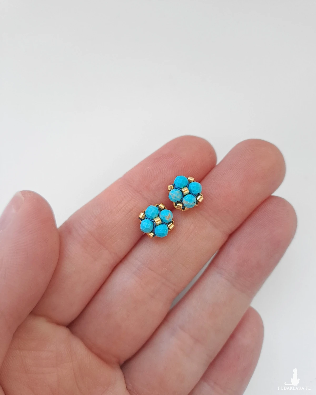 Sztyfty z turkusem zachwycają intensywnym, morskim odcieniem przełamanym naturalnym rysunkiem kamienia. Złota oprawa z koralików Miyuki dodaje im ciepła i elegancji, pięknie podkreślając nasyconą barwę turkusu. To połączenie tworzy wyrazistą, a jednocześnie harmonijną kompozycję, która rozświetla twarz i dodaje stylizacji świeżości. Niewielki rozmiar sprawia, że kolczyki są komfortowe w noszeniu przez cały dzień.