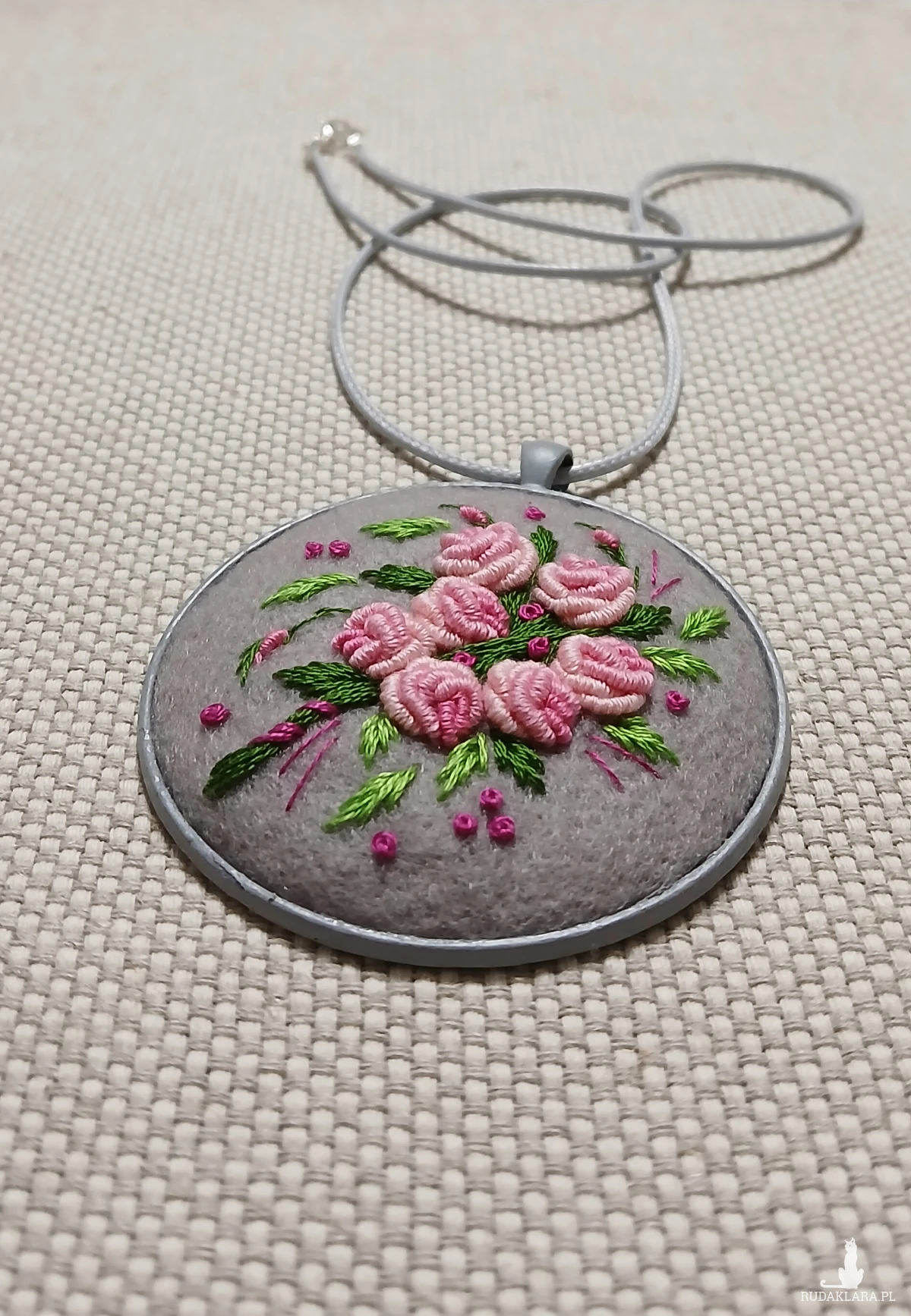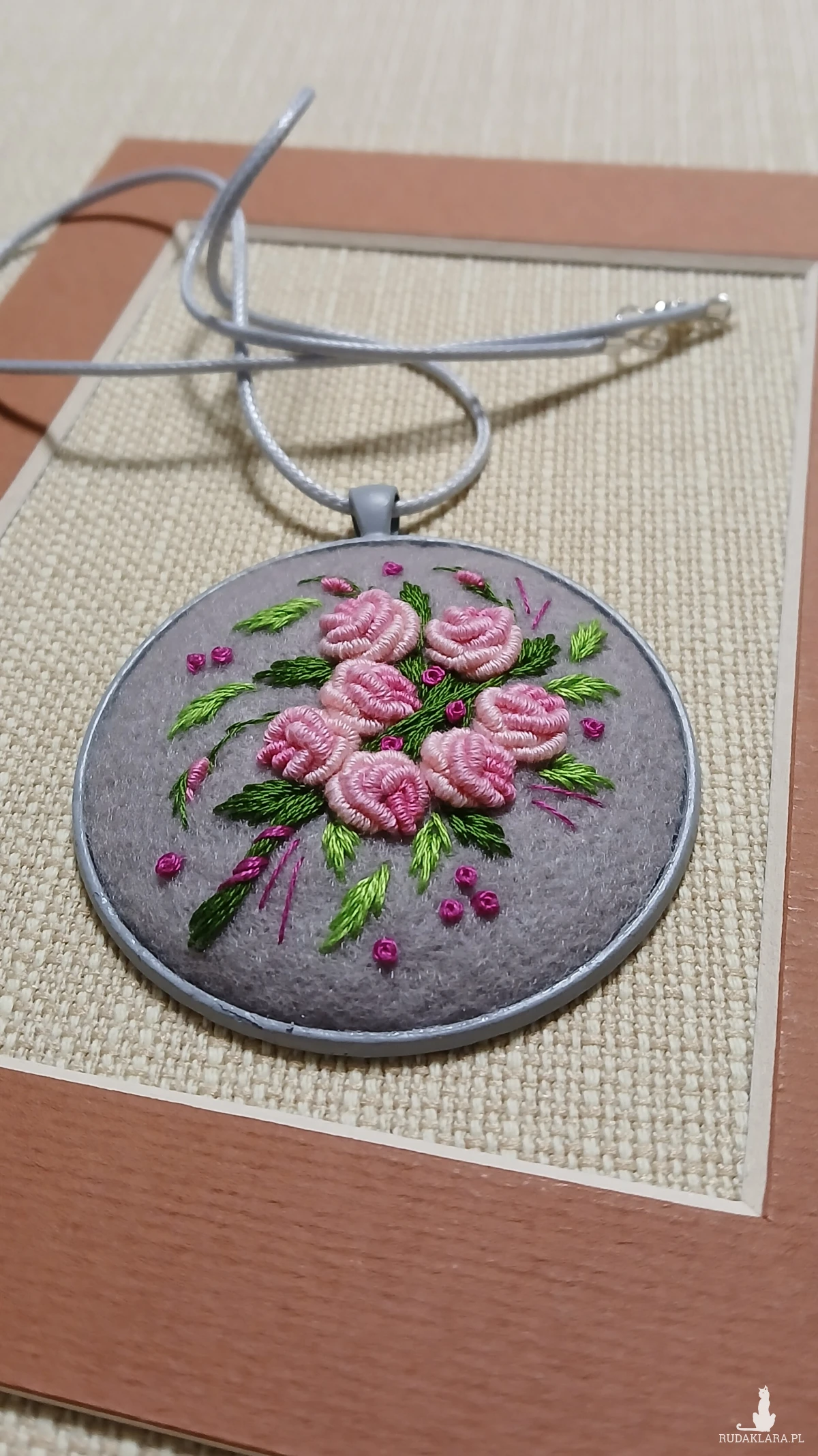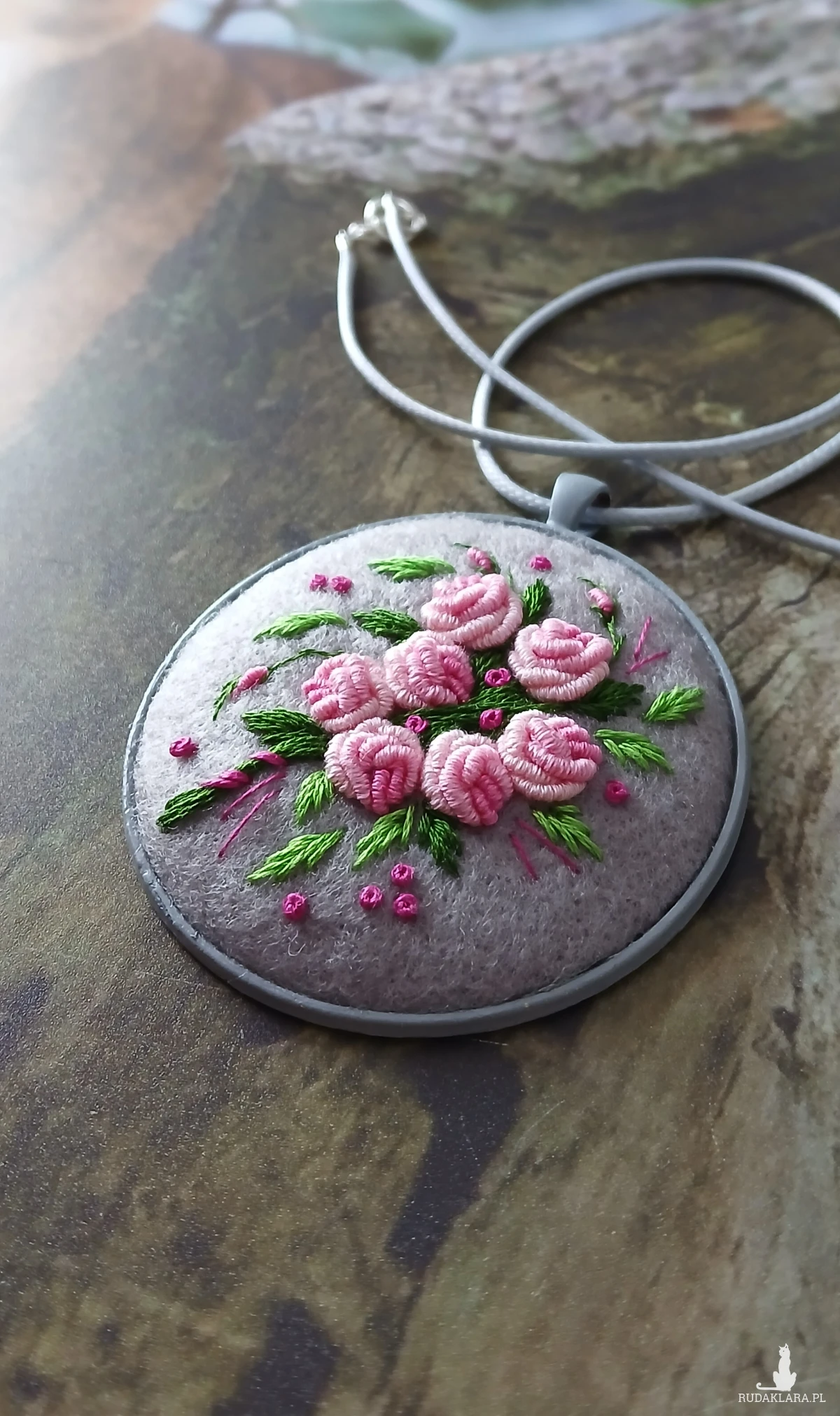 Bukiet różowych róż na lodowej szarości to romantyczne zestawienie kolorów w stylowym ogromnym wisiorze.