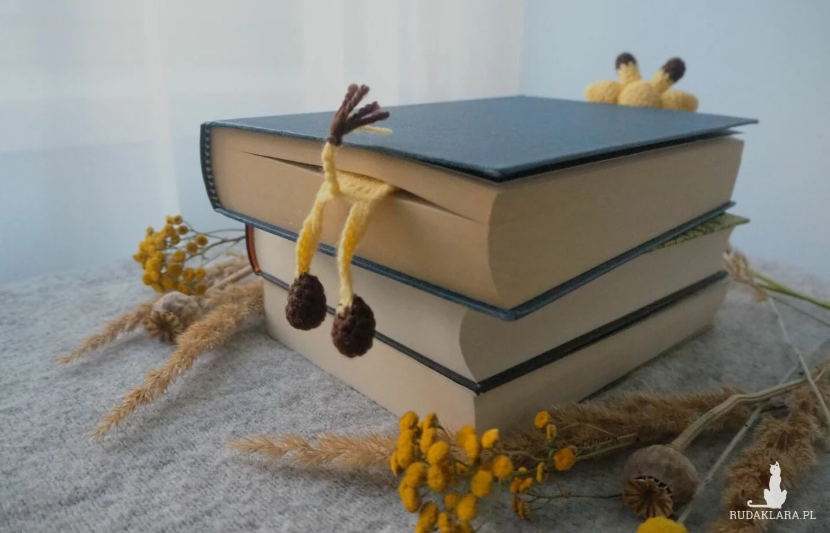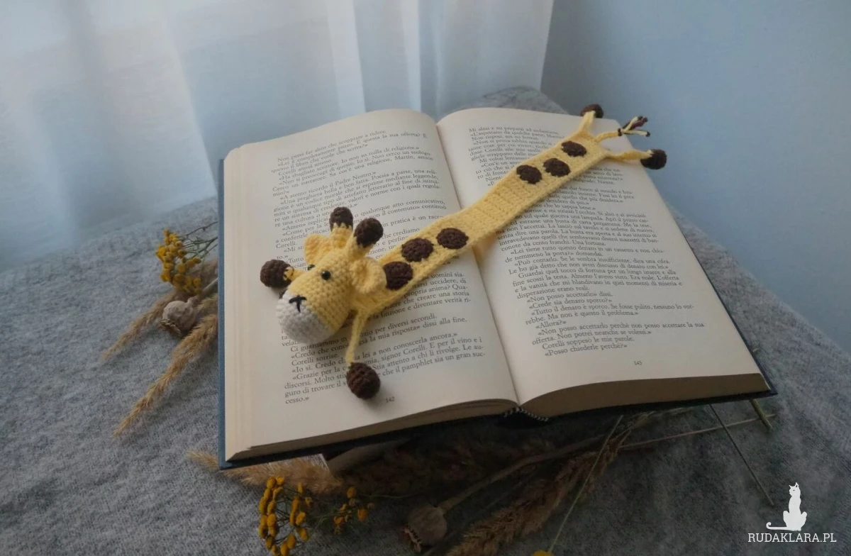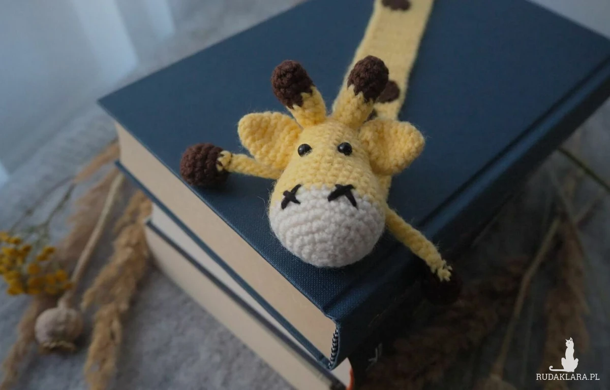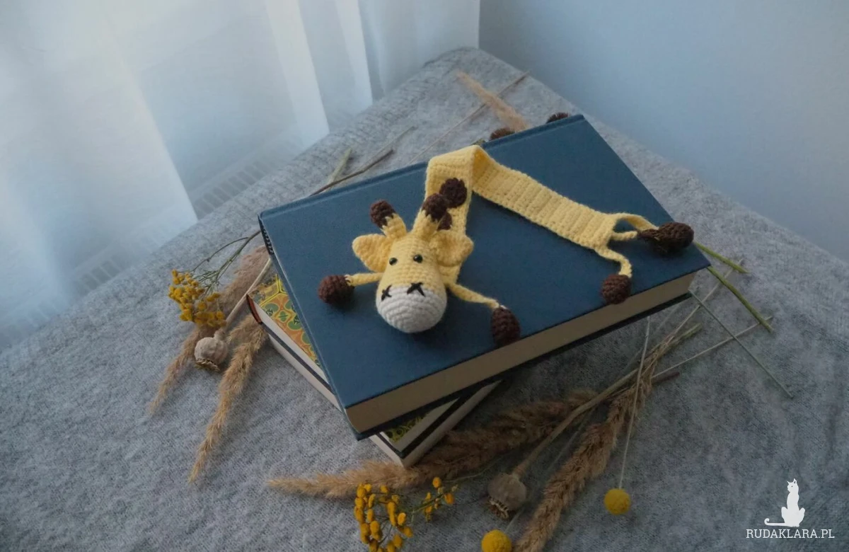Zakładka do książki z sympatyczną żyrafą wykonana z włóczki na szydełku.