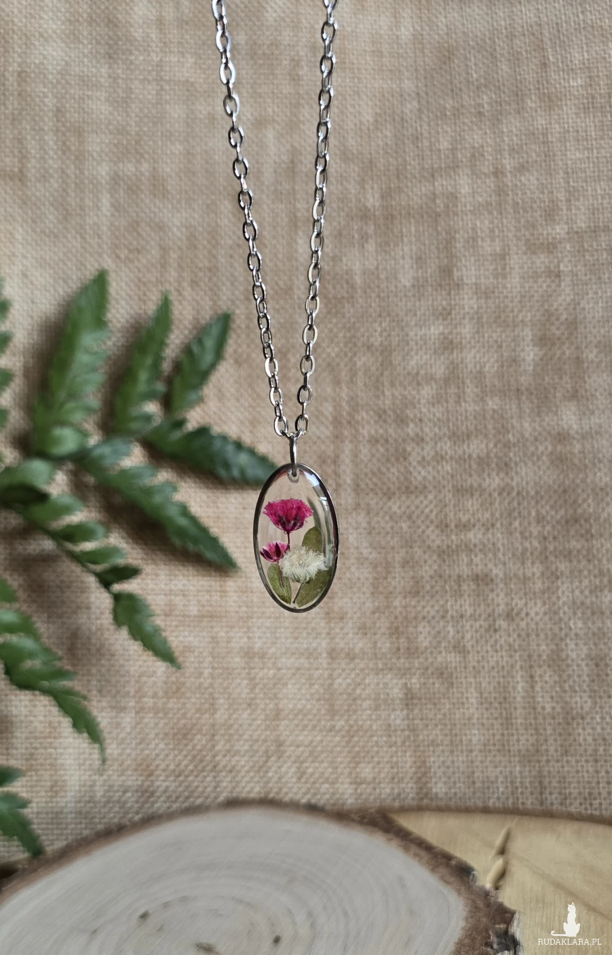 Oferuję Państwu unikalną biżuterię. Zawieszka jest wykonana z suszonych kwiatów i żywicy epoksydowej. Biżuteria jest wspaniałym i oryginalnym prezentem na lata.