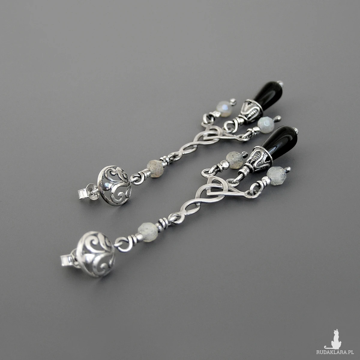 Długie kolczyki retro z kroplami onyksu o wymiarach 14 x 7 mm i małymi fasetowanymi kulkami labradorytu o średnicy 4 mm.