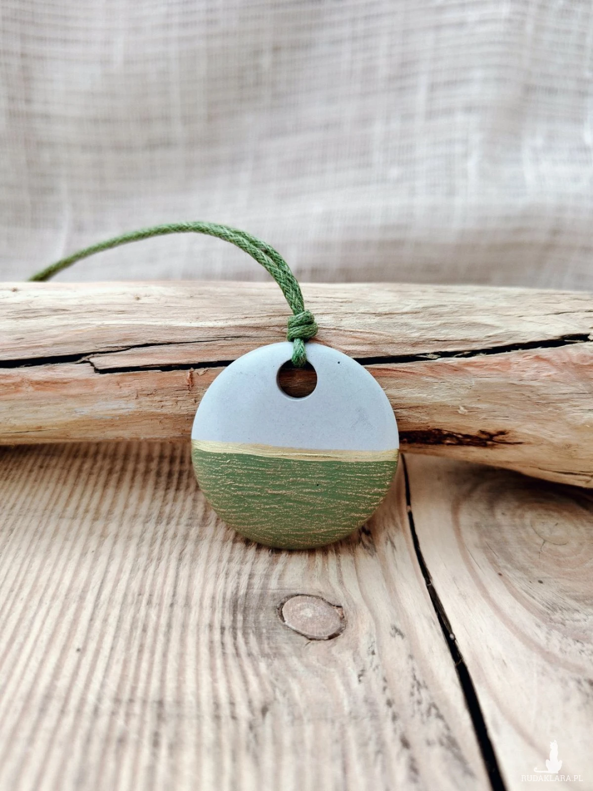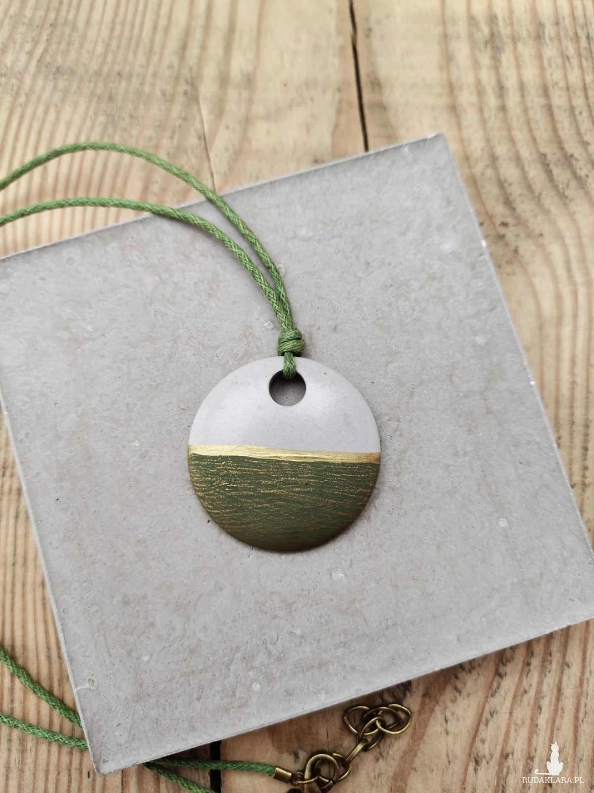 Unikatowy wisiorek wykonany ręcznie z betonu kreatywnego, łączący surową estetykę z delikatnym, naturalnym akcentem kolorystycznym. Okrągła forma została ozdobiona subtelnym przejściem barw – od jasnej, neutralnej góry po zielony dół z delikatną strukturą. Całość zawieszona jest na wytrzymałym, zielonym sznurku, który podkreśla naturalny charakter biżuterii. Wisiorek posiada wygodne zapięcie na karabińczyk oraz przedłużający łańcuszek, co umożliwia regulację długości.