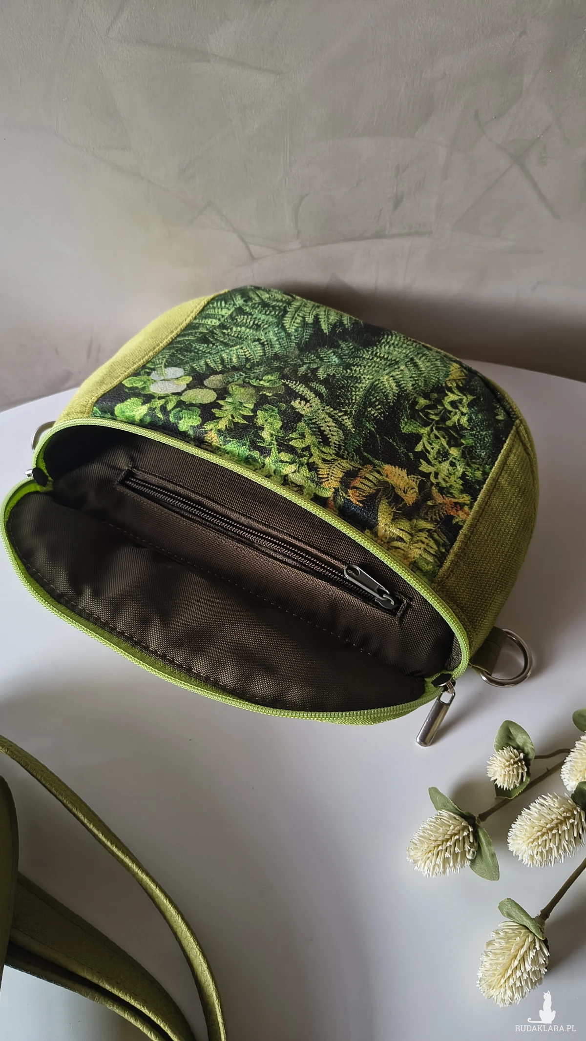 Torebka wykonana z weluru tapicerskiego pozyskanego z końcówek poprodukcyjnych oraz ekoskóry. Dlatego jest tylko jedna. Jest niezwykle miła i miękka w dotyku. Wewnątrz znajduje się wodoodporna podszewka z kieszonką na zamek.
