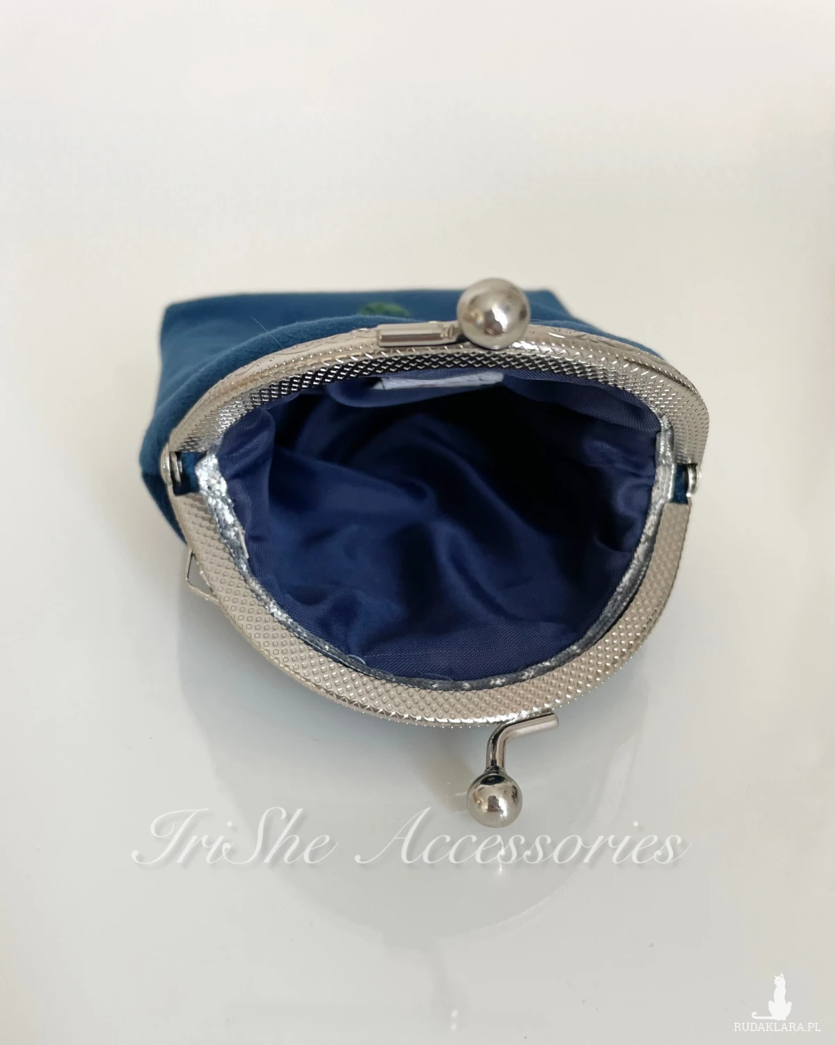 Granatowa portmonetka "Kwiat lnu" z autorskiej kolekcji portmonetek haftowanych – własnoręcznie uszyta i haftowana, wyjątkowo lekka i miękka, doskonała na każdą okazję.