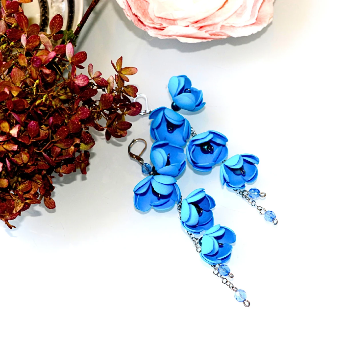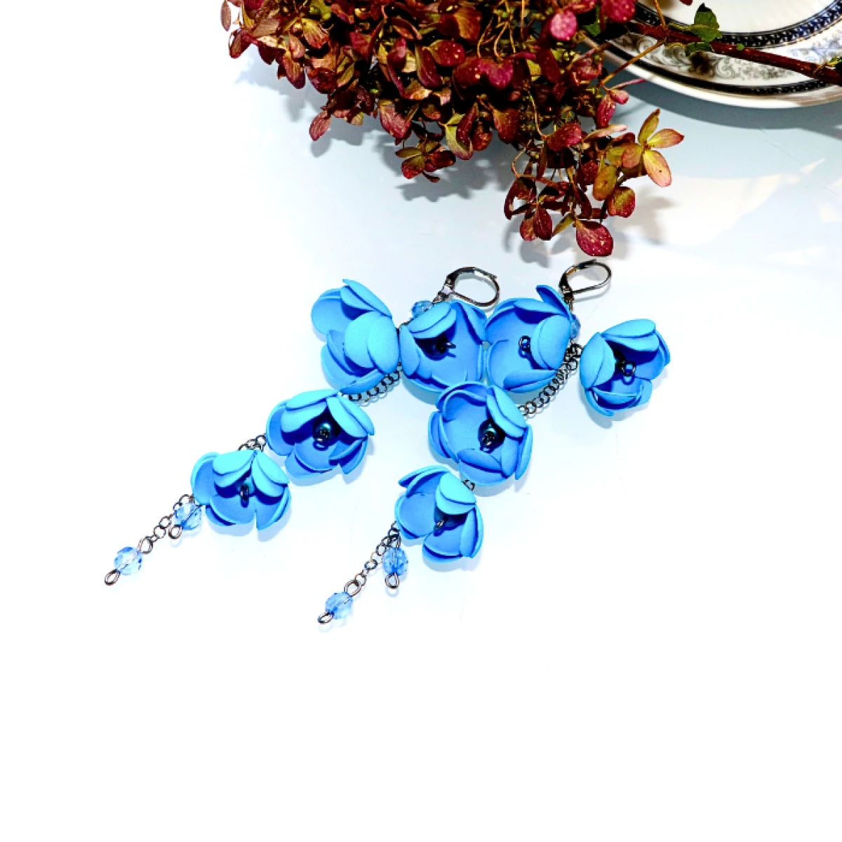 Te efektowne, długie kolczyki kwiatowe w odcieniach błękitu i lazuru to idealna propozycja dla kobiet ceniących biżuterię romantyczną, a zarazem nowoczesną. Każdy kwiat został ręcznie uformowany z niezwykle lekkiej pianki (foamiranu), co sprawia, że kolczyki są niemal niewyczuwalne podczas noszenia, mimo swojej imponującej długości.