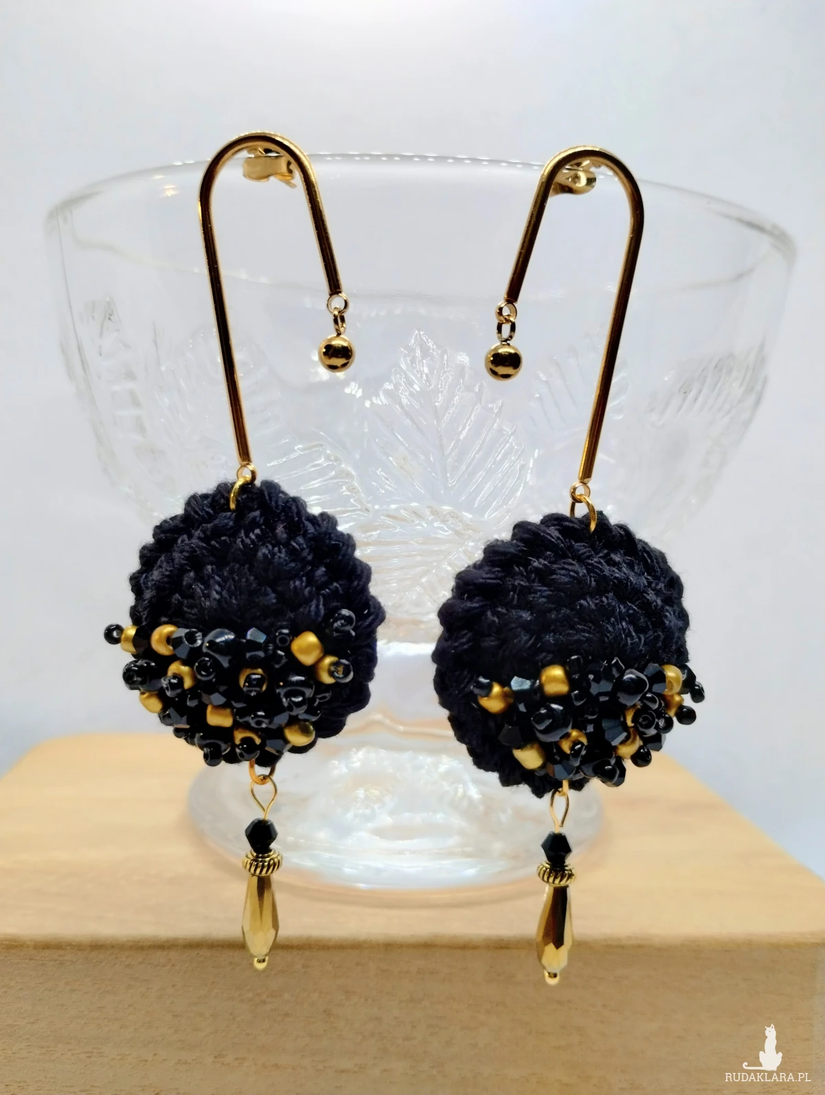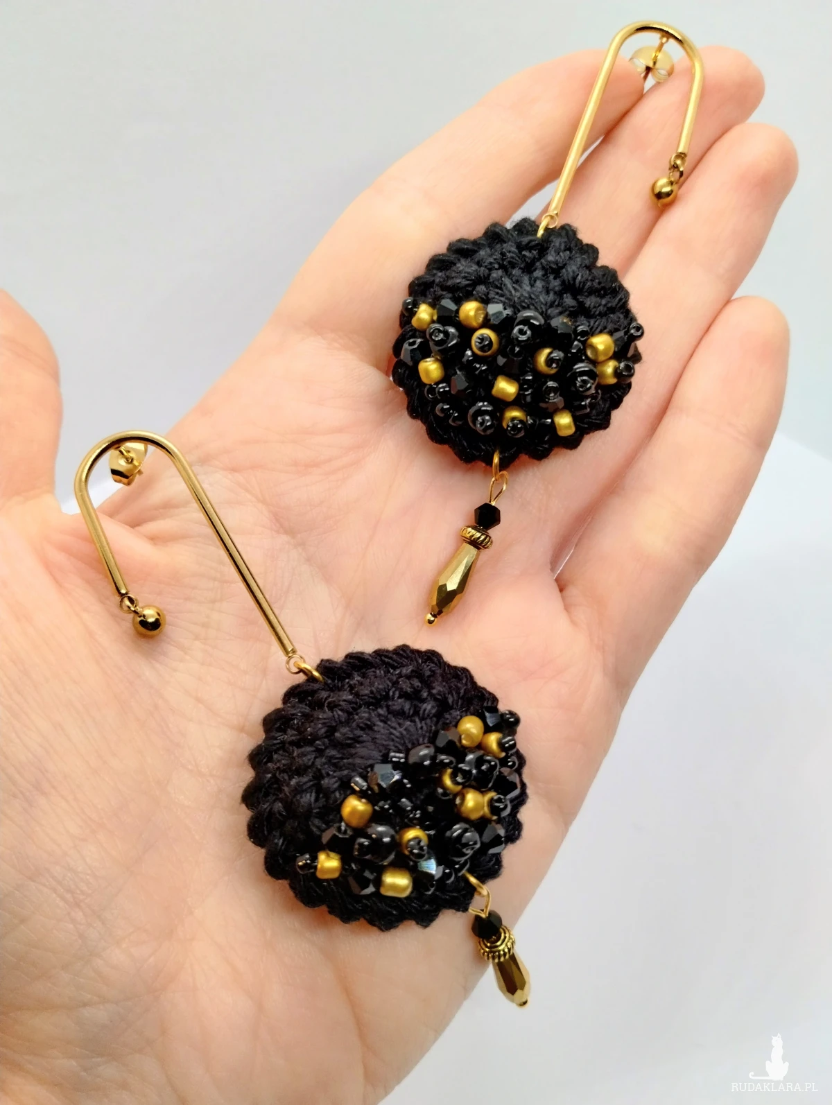 Czarne kolczyki szydełkowe ze złotymi akcentami.