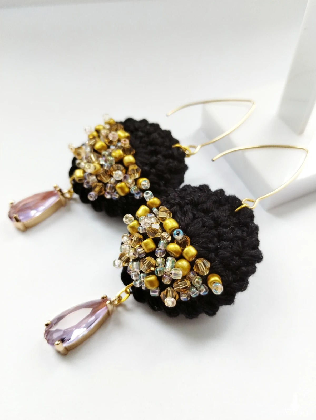 Czarne kolczyki szydełkowe z akcentami złota i fioletu.