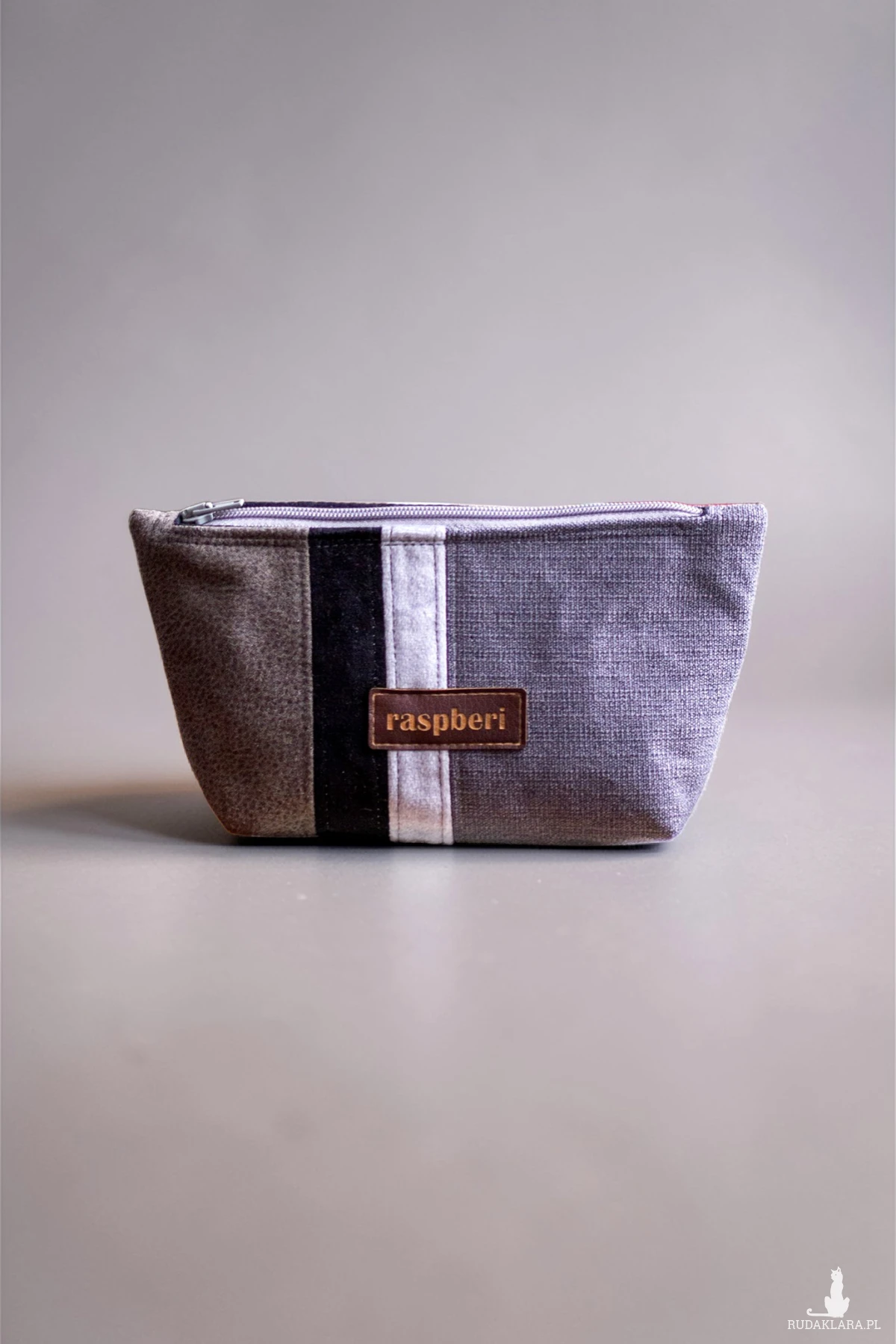 Średniej wielkości kosmetyczka wykonana kilku rodzajów tkanin. Stworzona w duchu no waste.