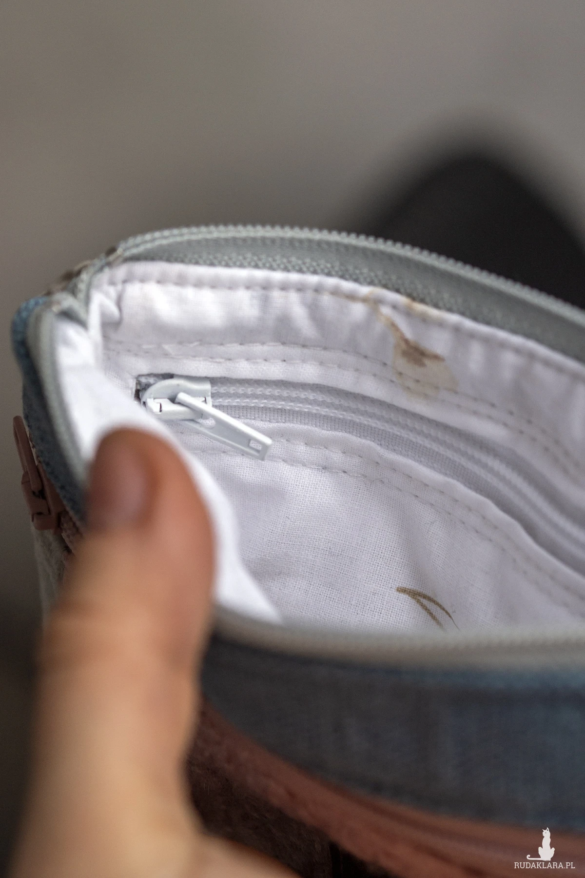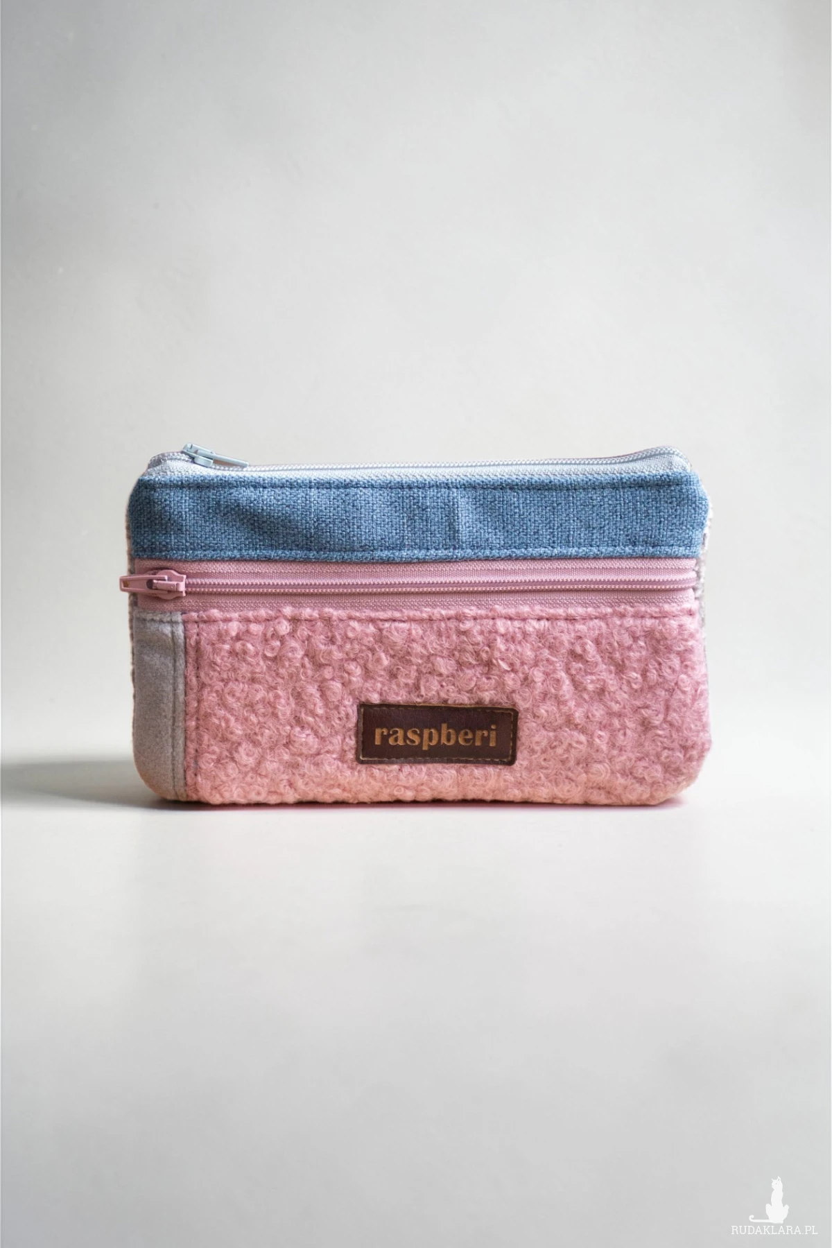 Prosty wodoodporny portfel wykonany z kilku rodzajów tkanin w odcieniach szarości i różu i błękitu.