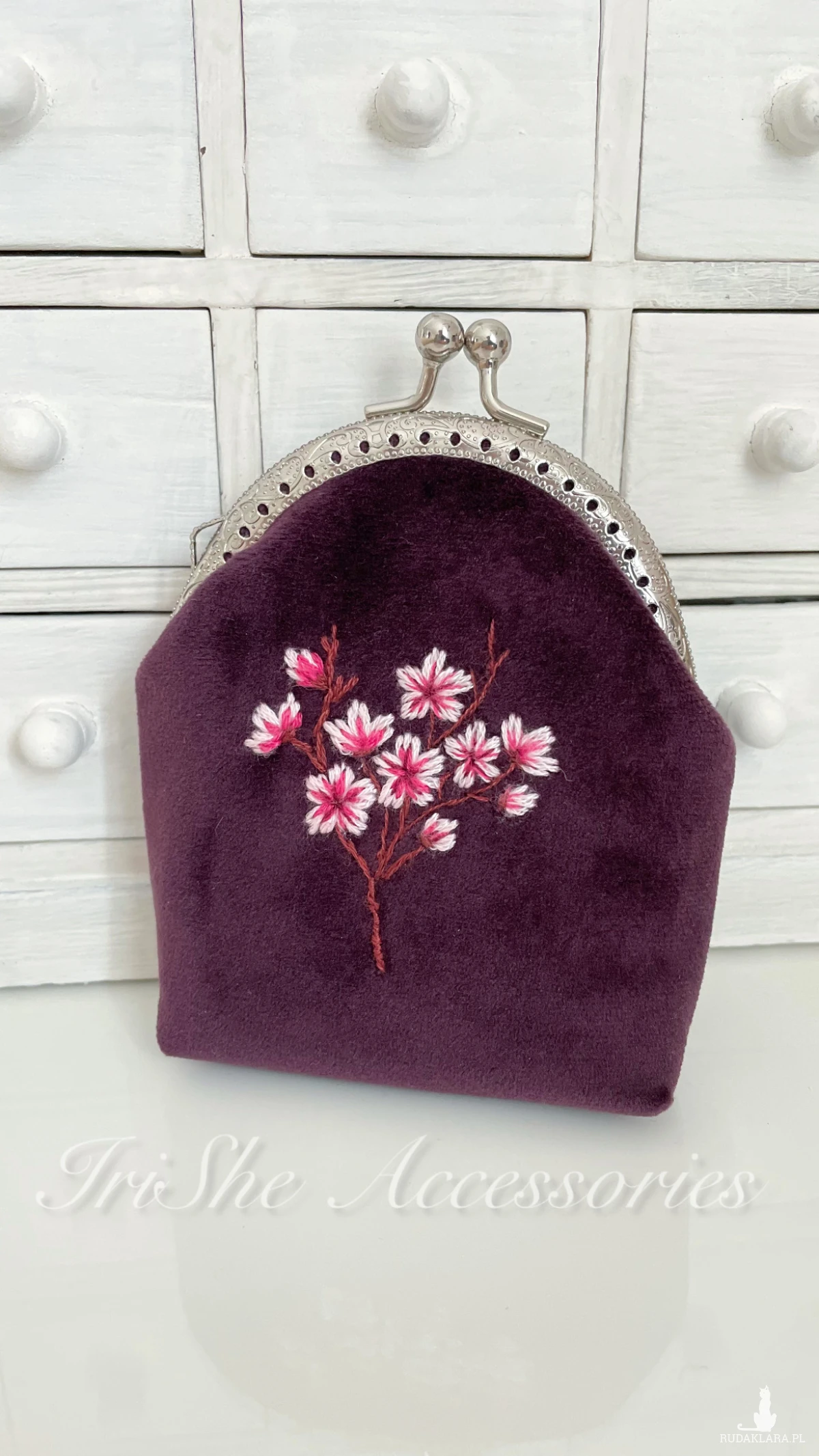 Oberżynowa portmonetka “Sakura" – uszyta i haftowana ręcznie, wyjątkowo lekka i miękka, doskonała na każdą okazję.